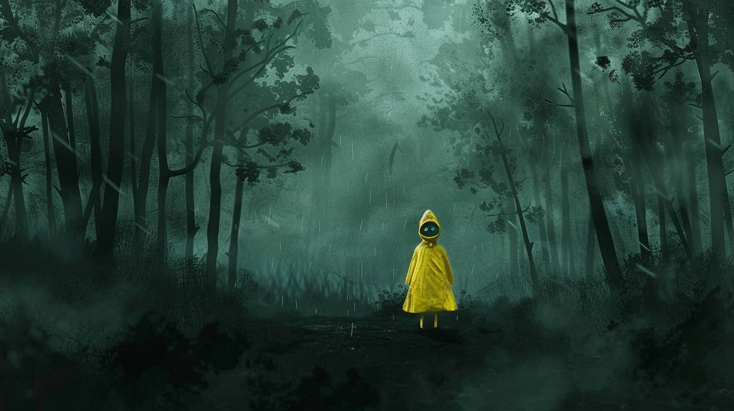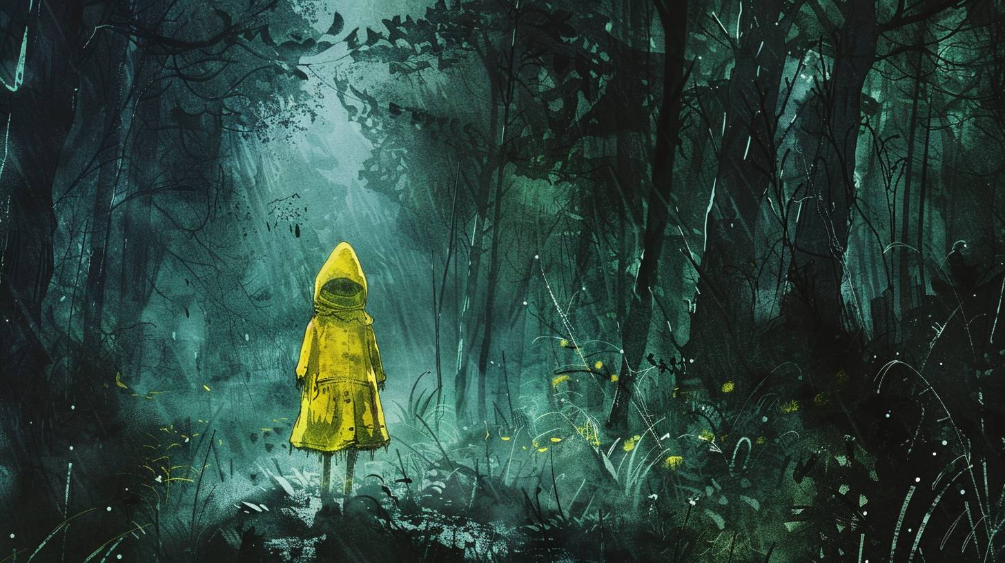 detailed watercolour, cartoon, Coraline in a yellow raincoat, standing in a dark forest, muted green, diffuse light, cinematic, Neil Gaiman --ar 16:9 --v 6.0