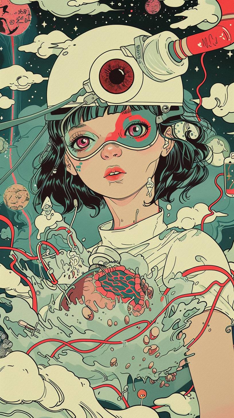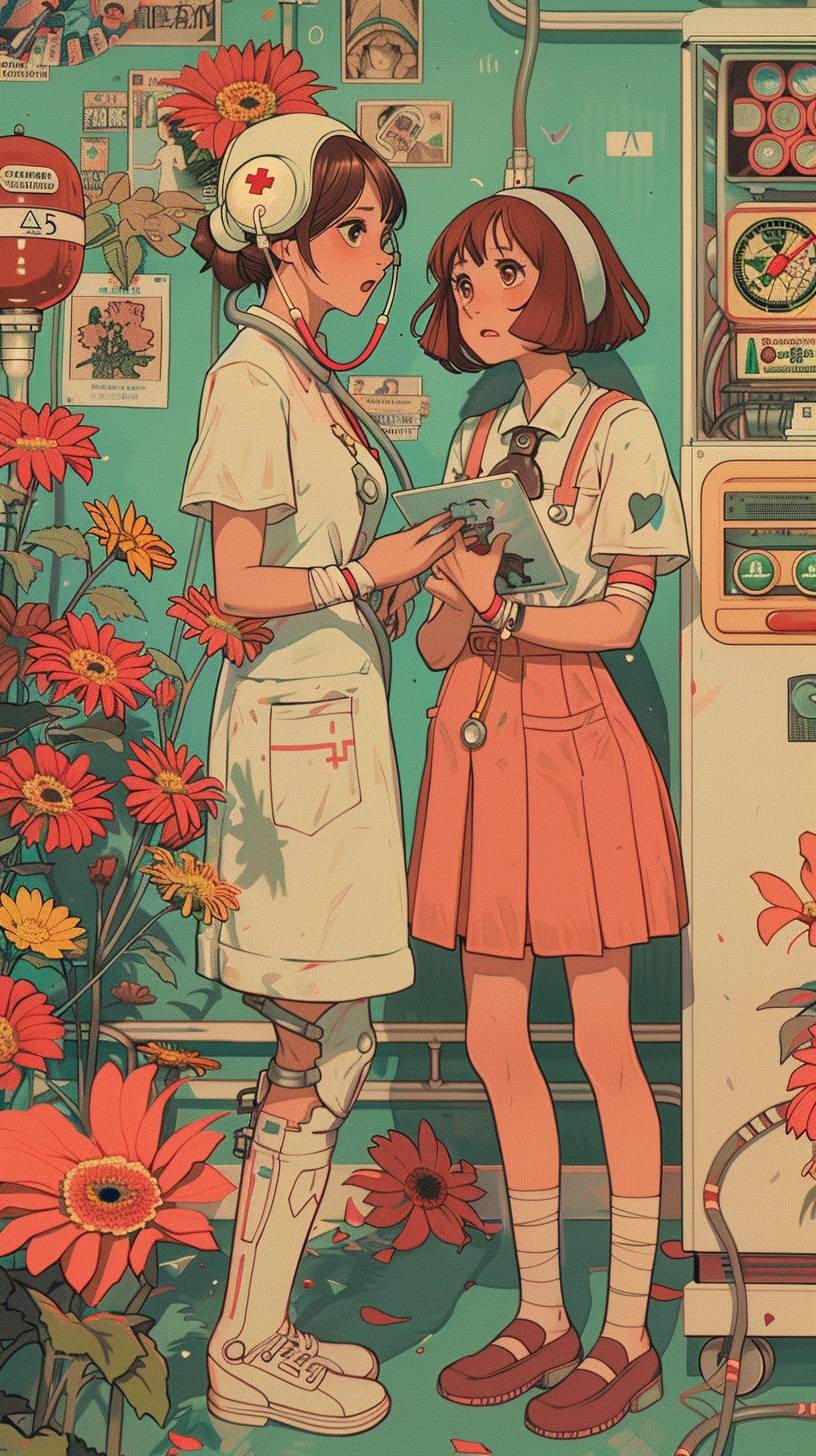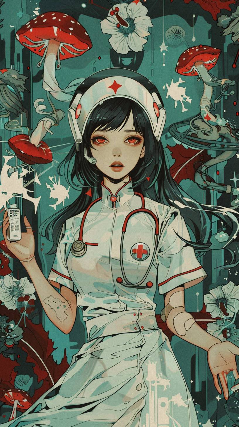 nurse using predictions to route a patient down the right path of care colors by Okumura Togyu, featuredon pixiv, toyism, tarot card, anime aesthetic, flatcolors --ar 9:16 --v 6.0