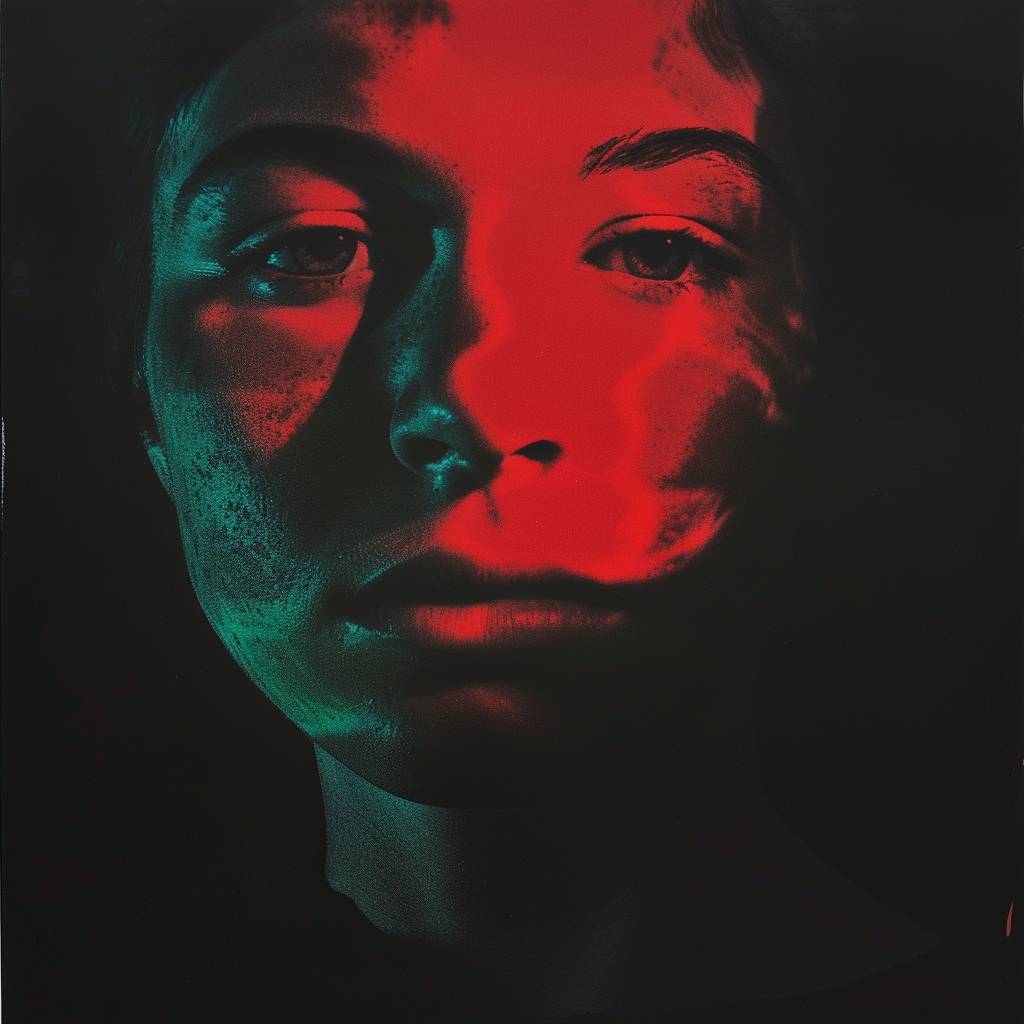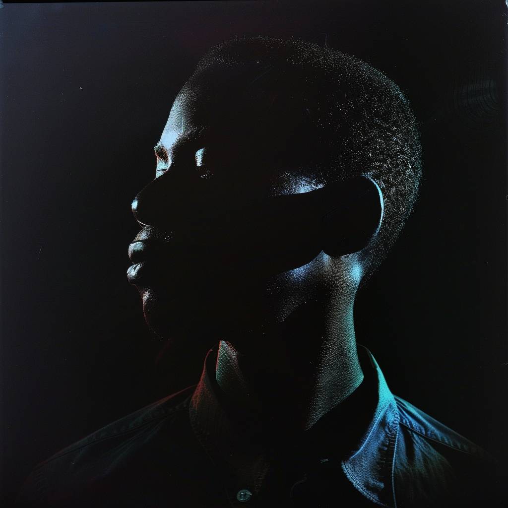 Photography, untitled, in the style of dark black and [color], luminous shadows, flat figuration, high gloss, self-portrait, high detail