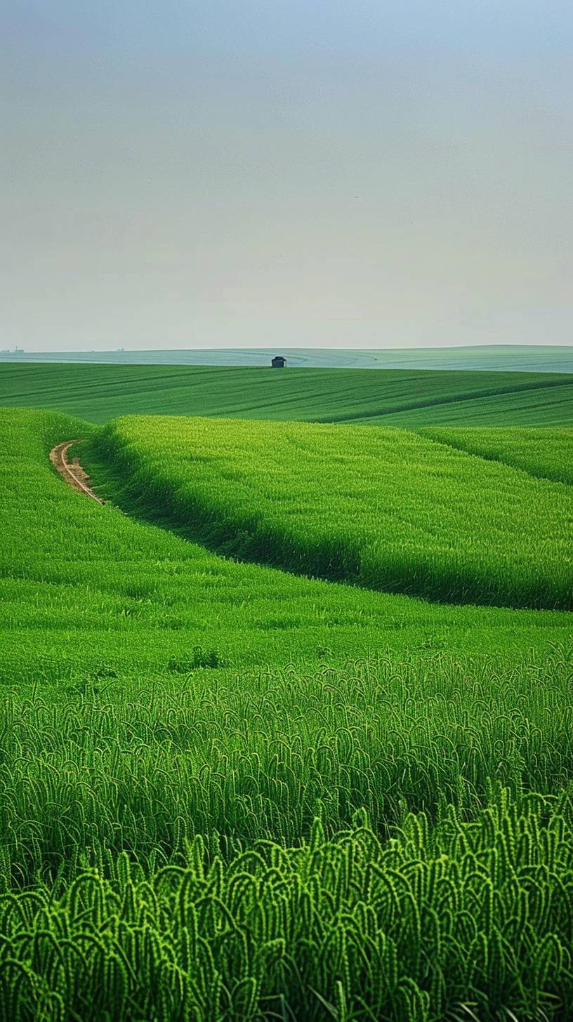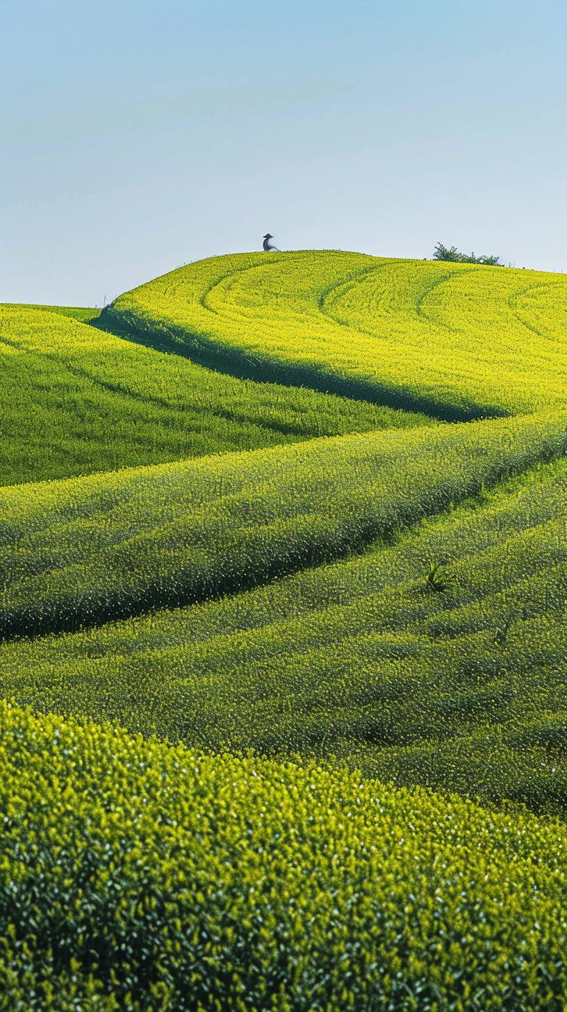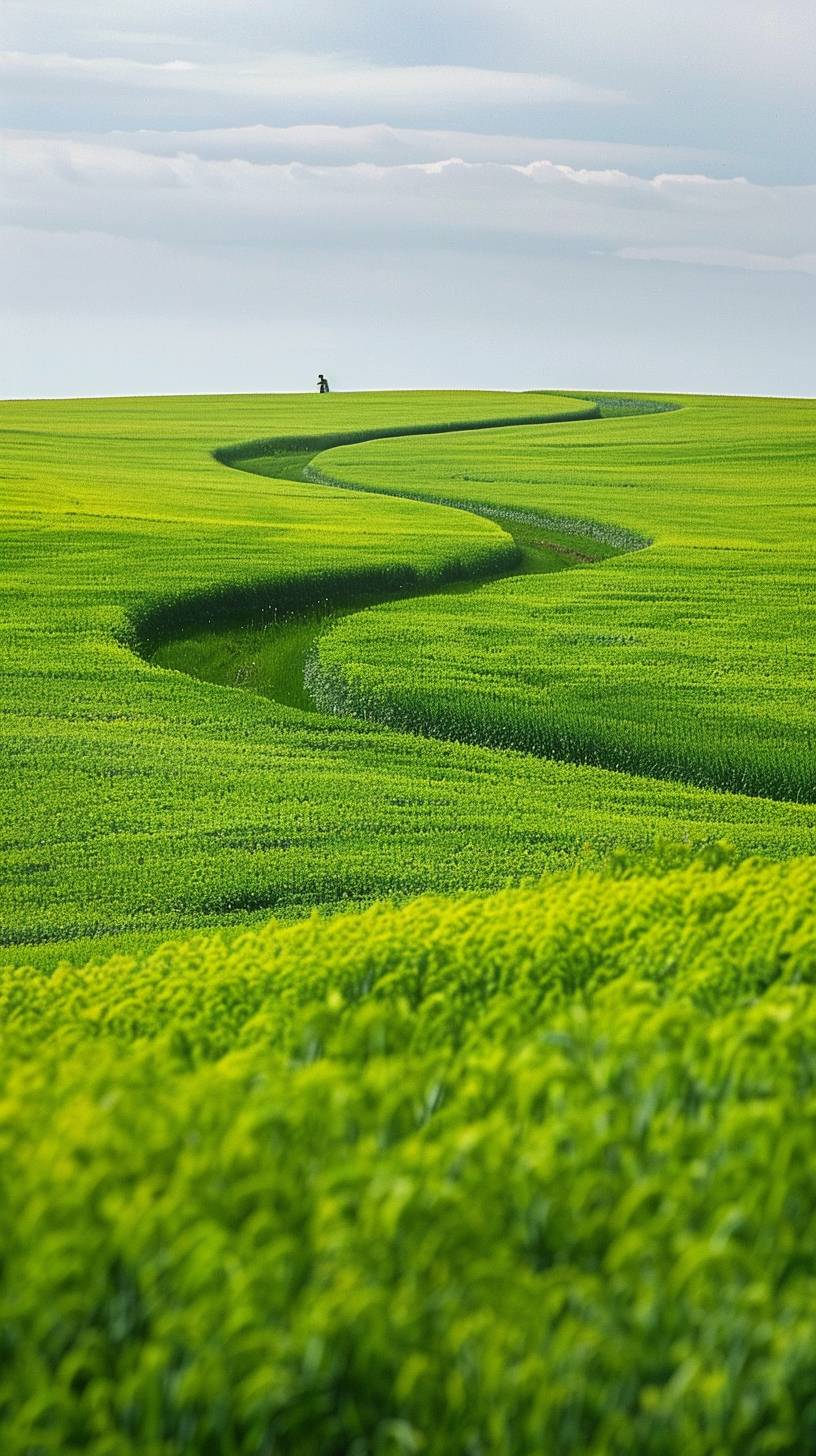 The vast and curved green rapeseed, endless sky, clean sky, there is a Chinese farmer working in the distance, long lens shooting, telephoto lens, 8K, high quality, high detail. --no mountain,cloud --ar 9:16 --v 6.0