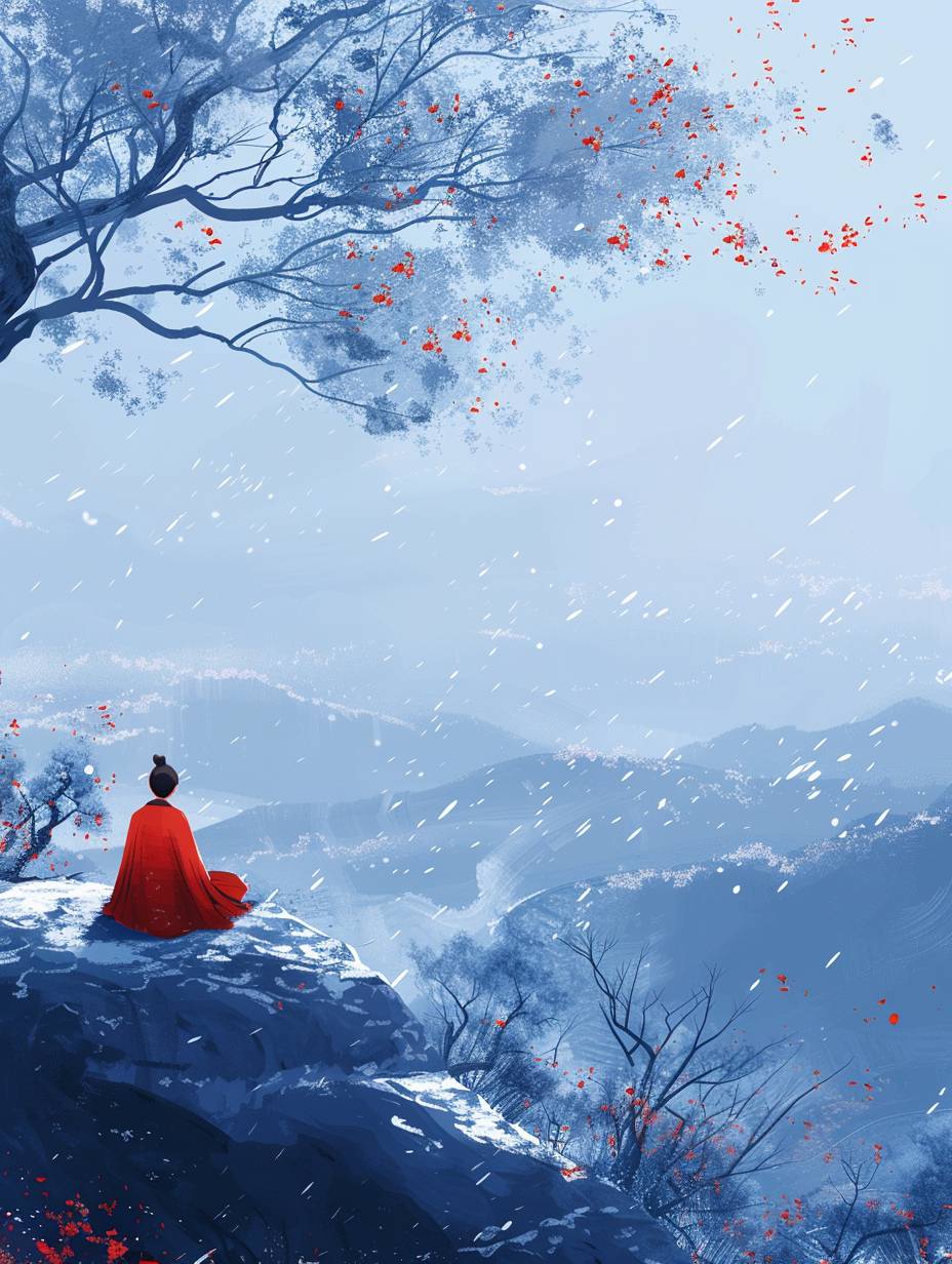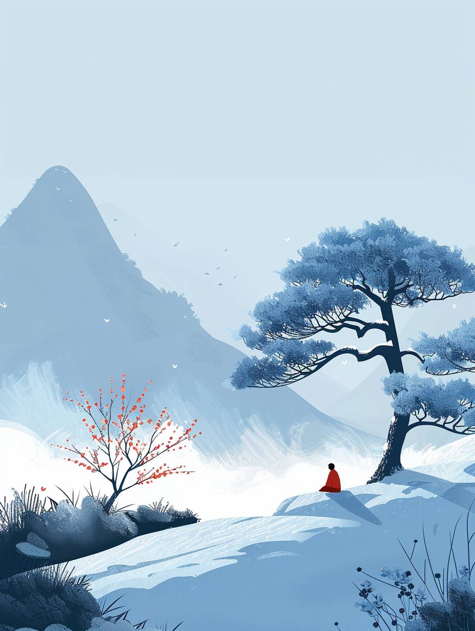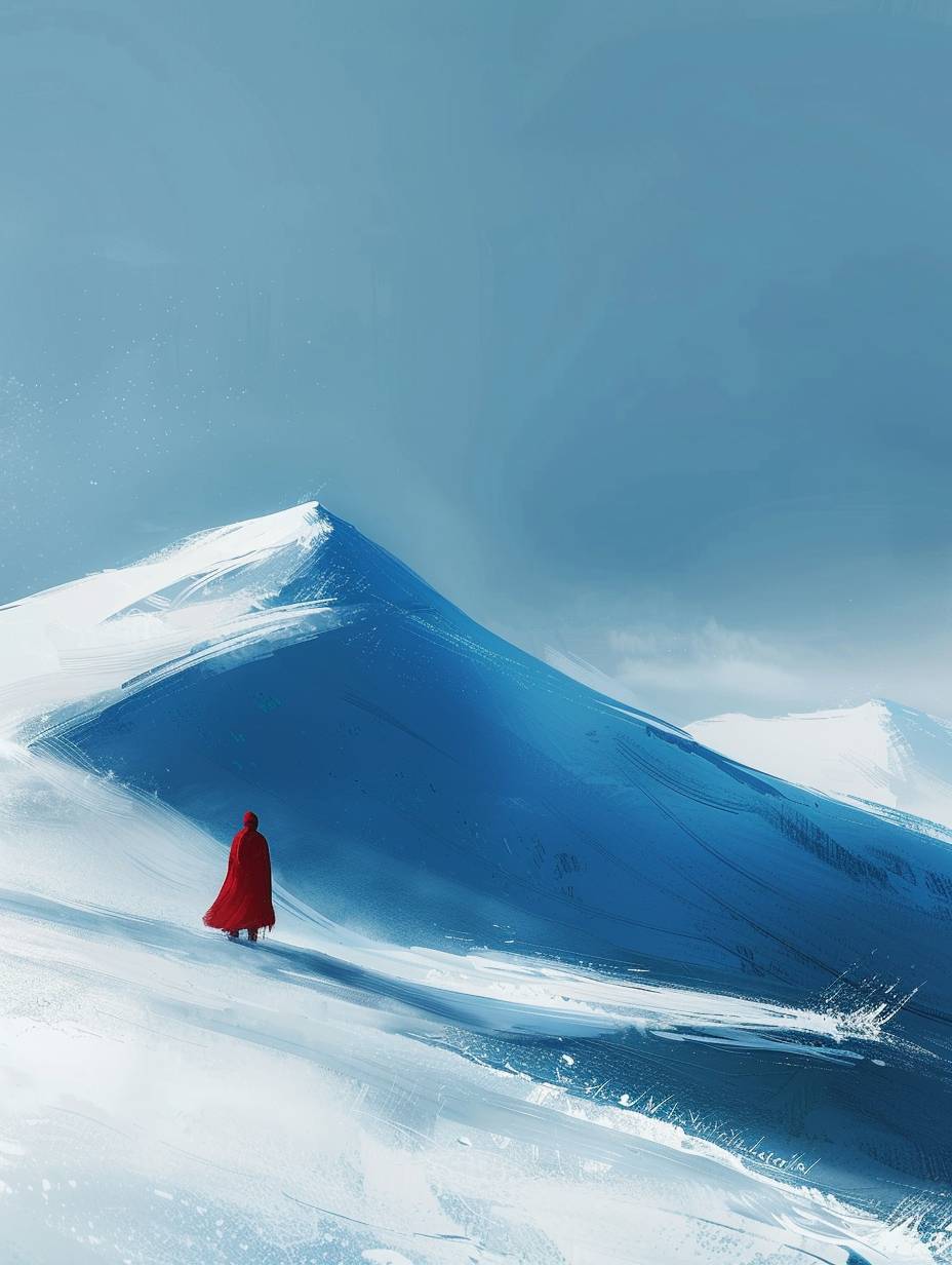 Simple and clean, simple and clean, simple and clean. Its concise, clean and simple overhead lens depicts the snow mountains in Tibet. A snow-covered mountain is bathed in the soft light of dusk. The mountain is decorated with complex snow patterns. The clear blue sky above creates a quiet and powerful atmosphere. A monk from Tibet meditates on the mountain. This is like heaven on earth. The beautiful scenery brings peace to people. Large area white space, minimalism, brushstrokes, red color palette. Large white space, large color blocks, high-definition details, textured embroidery style, flat painting, ultra-high resolution. The slender lines display the rich colors and textures of the scene. This is an original work with Van Gogh's unique brushstrokes, featuring the style of Takashi Murakami. Art Nouveau movement, matte texture, minimalism, flat posters.