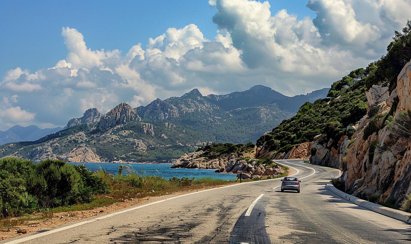 Generate a realistic image of a car traveling on a road along the coast of Sardinia.