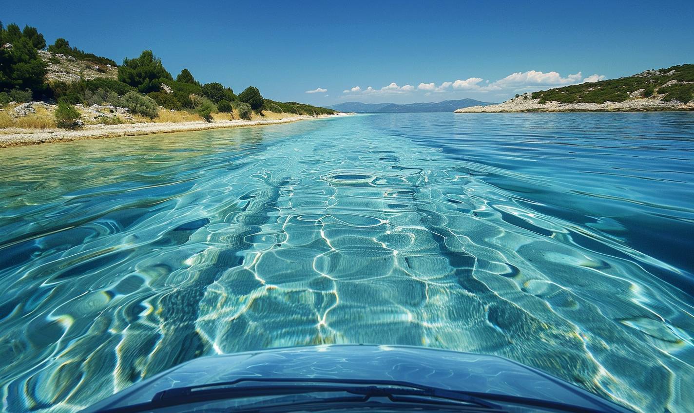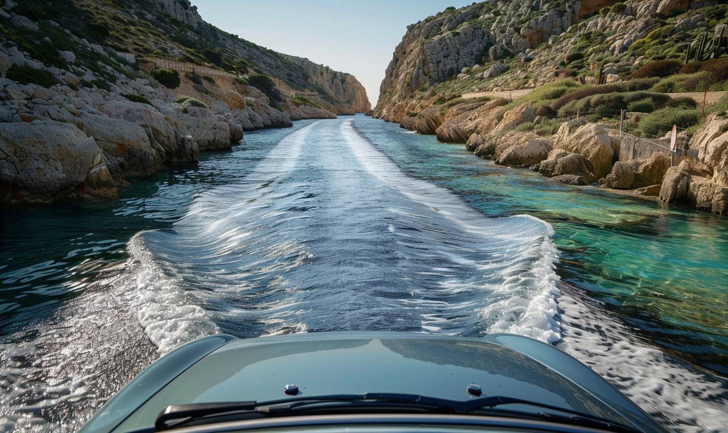 Generate a realistic image depicting a car traveling on a road along the coasts of Sardinia. The images should represent a sunny day with crystal clear water. The image of the car should be clearly visible. Thank you!