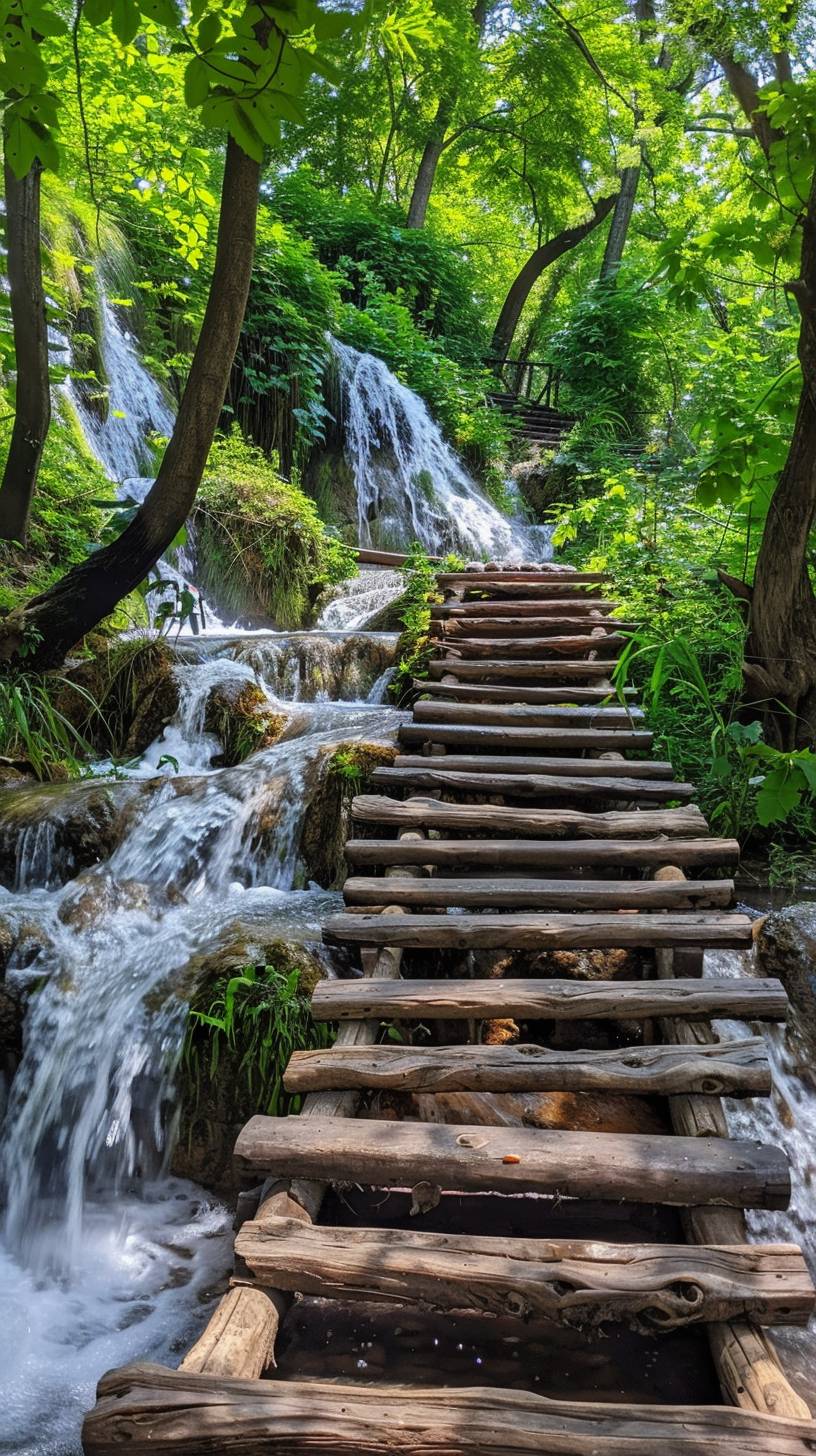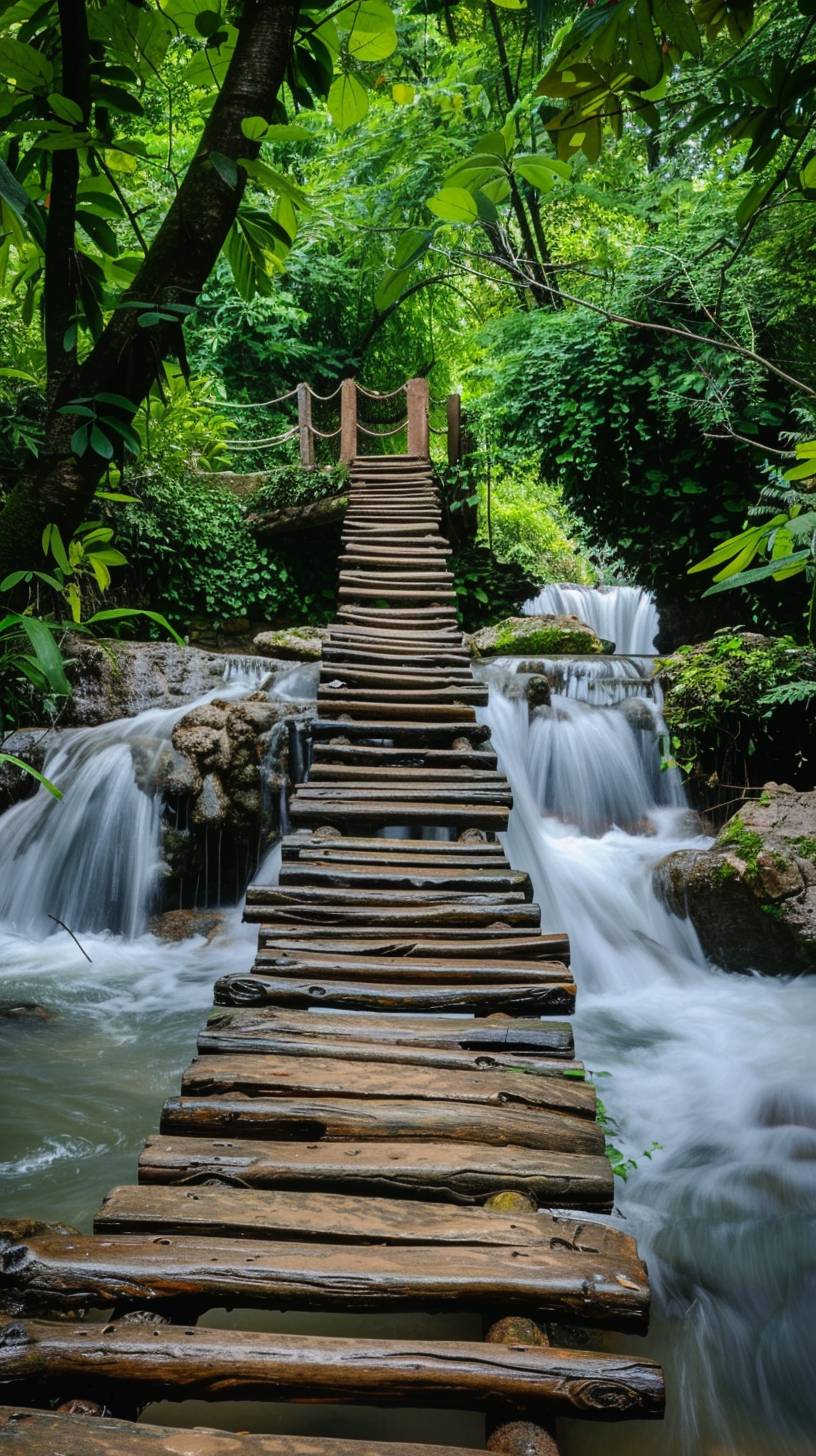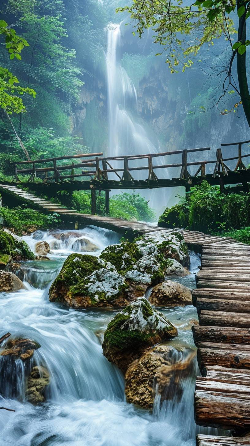 3D wallpaper design with an old wooden bridge and waterfall theme