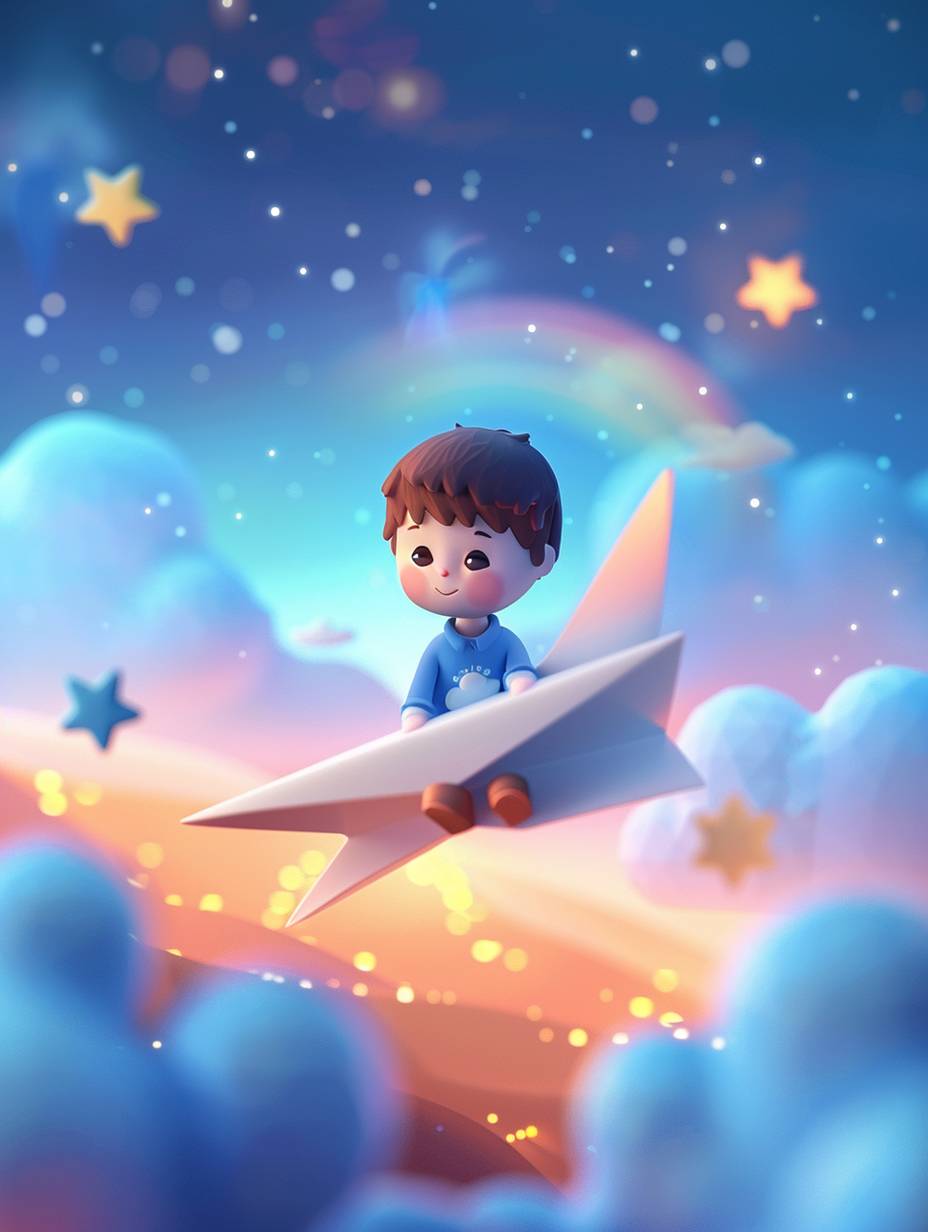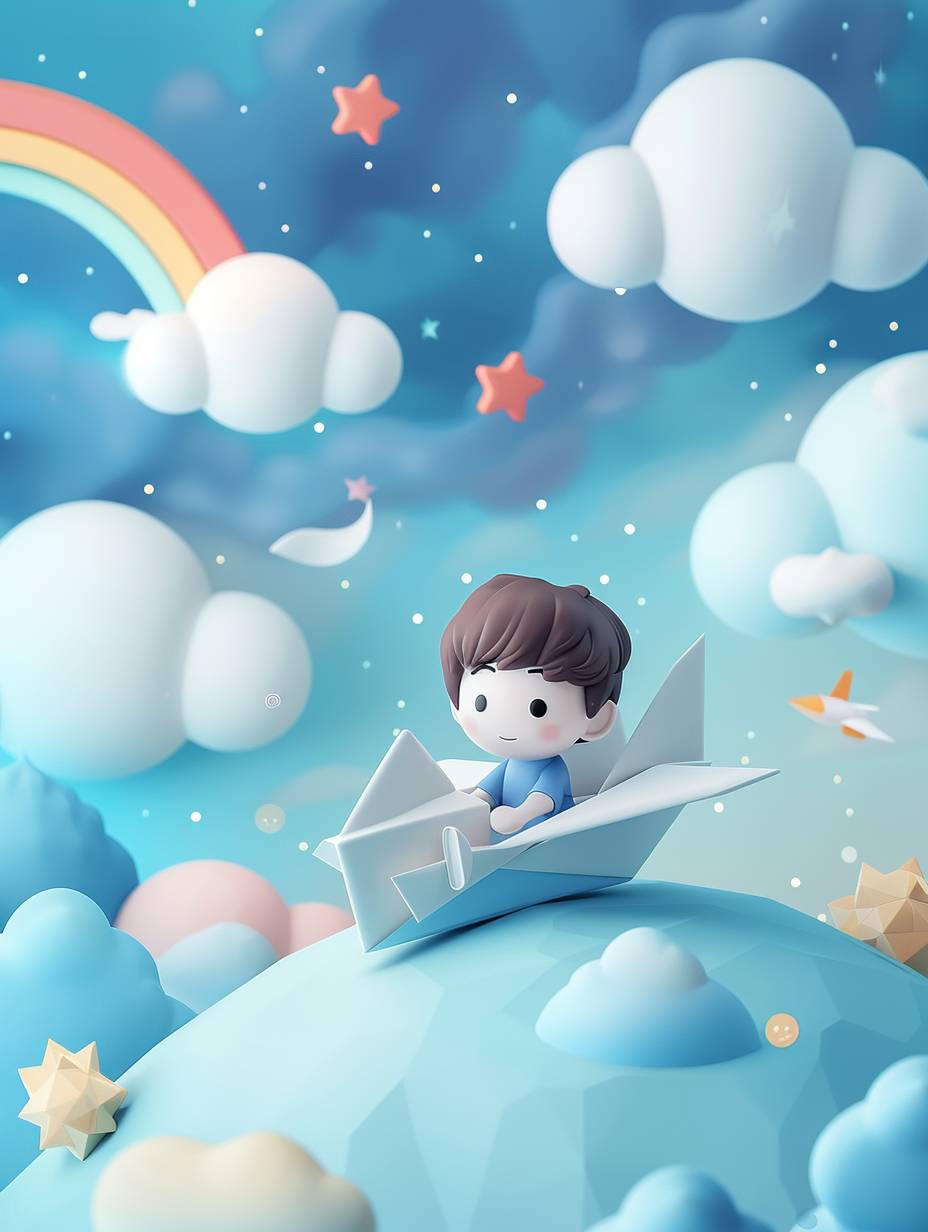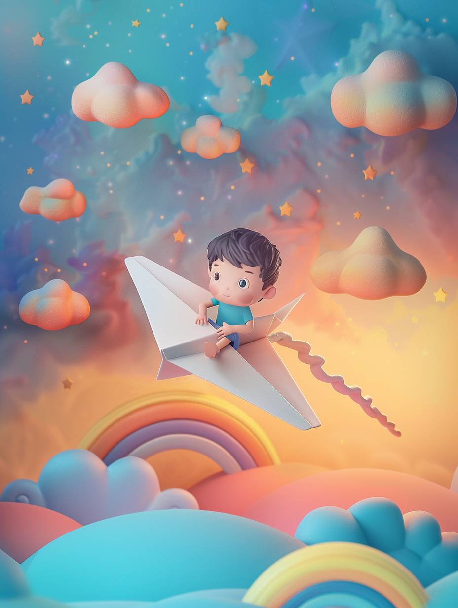 A cute boy in a blue shirt sits on a white paper airplane and flies at dawn, with floating clouds, rainbows and stars in the background sky, handmade clay cartoon style, colorful clay animation with soft lights and pastel colors, kawaii Art clay toy style, using clay material, 3D rendering style, isometric view, --ar 3:4 --v 6.0