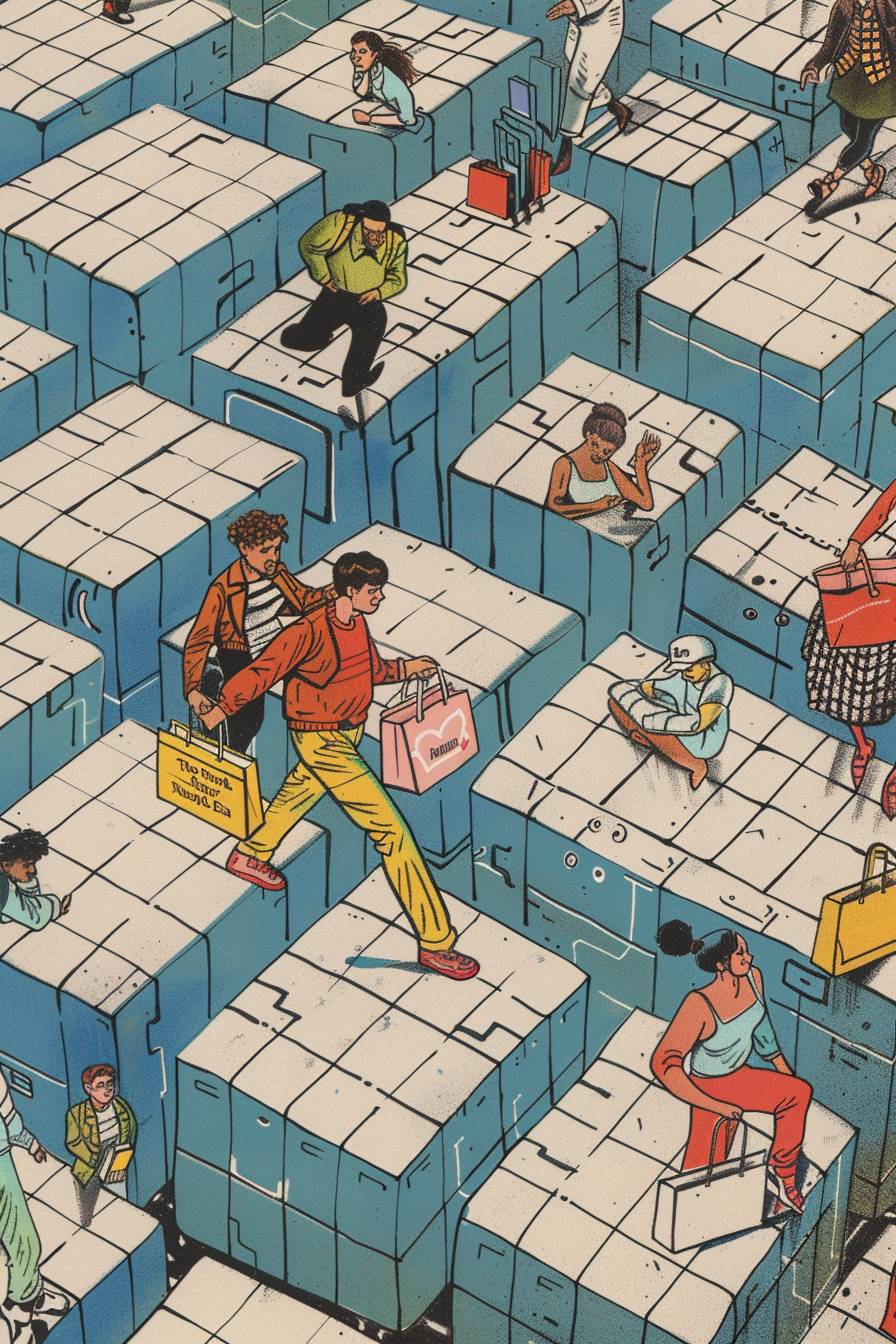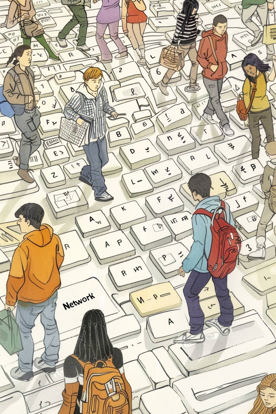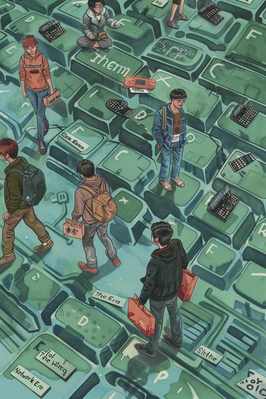 In the book "The Network Era", there is an illustration of people living in a world made entirely of giant computer keyboard keys, and on each key, several young men hold shopping bags while talking to their female partners. The title text reads ""BACKUP morphing into AI." There is also another drawing with numerous women holding dog collars, adding some romance. All images have been created using handdrawn techniques such as marker drawings or oil paintings in the style of various Artists. --ar 85:128 --style raw --stylize 50 --v 6.0