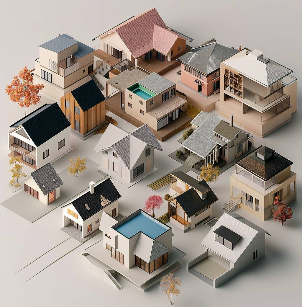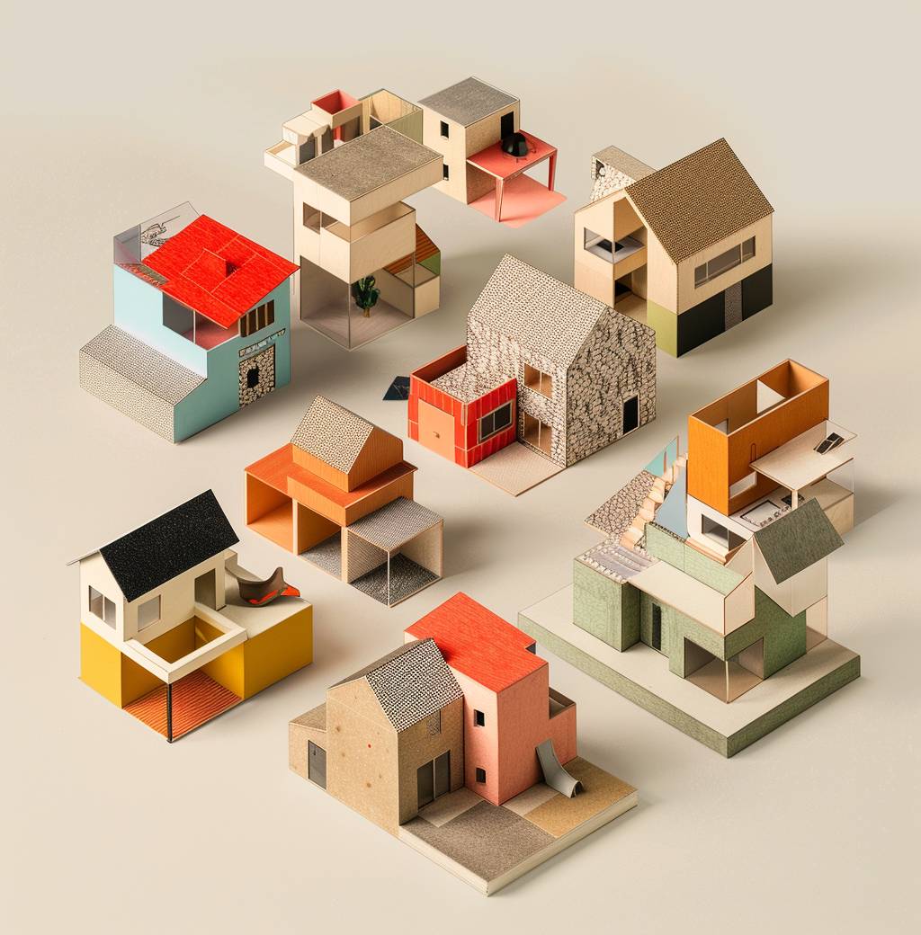 A series of architectural models, each representing different types or styles of houses and buildings, arranged on top of one another to form an overhead view that shows the arrangement in three dimensions. The models include simple square block structures with gable roofs, complex fractal designs, shapes resembling modernist architecture, minimalist lines, and colorful tones, all set against a neutral background. This visual representation highlights how these forms can be combined into unique compositions.