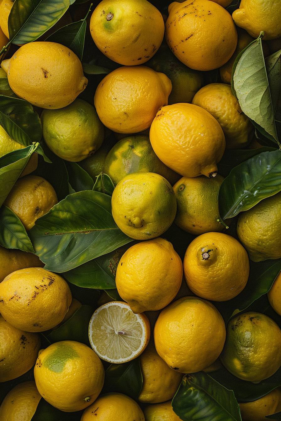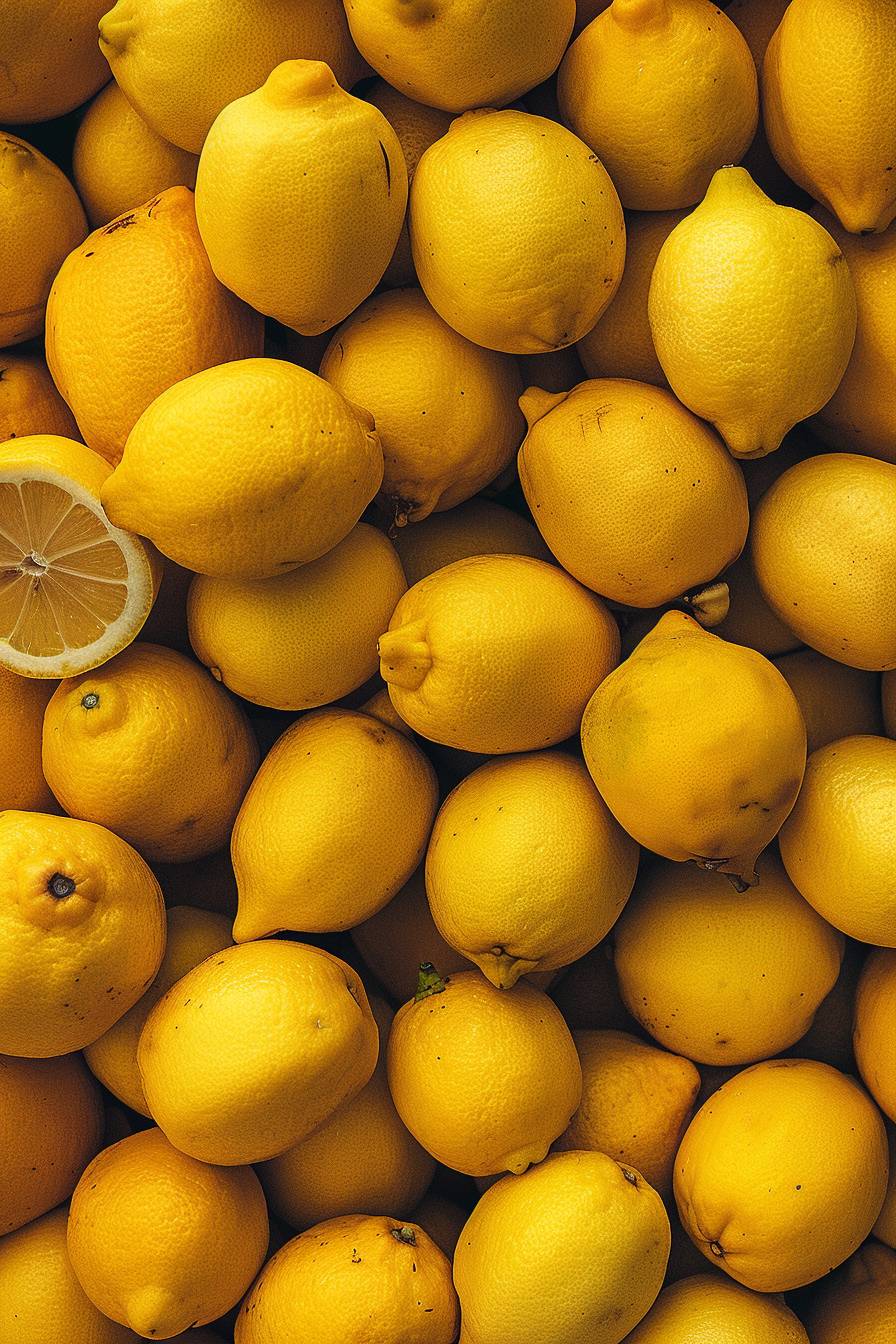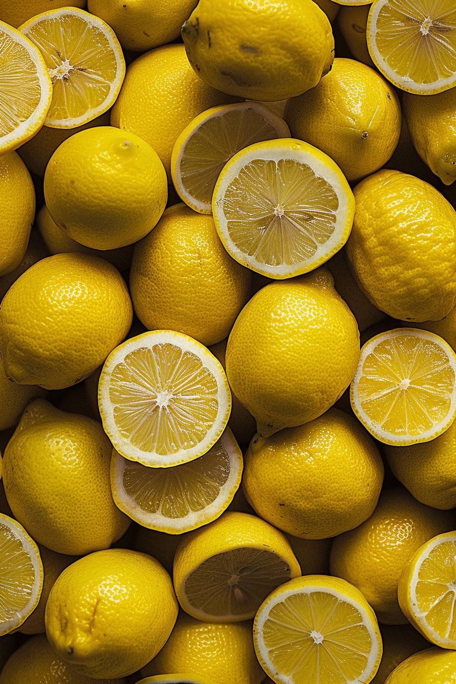A pile of many lemons, fresh and juicy, bright neon yellow color, natural light, overhead shot, closeup, high resolution photography, rich in details, with clear focus and high definition, in the style of high quality --ar 2:3 --v 6.0
