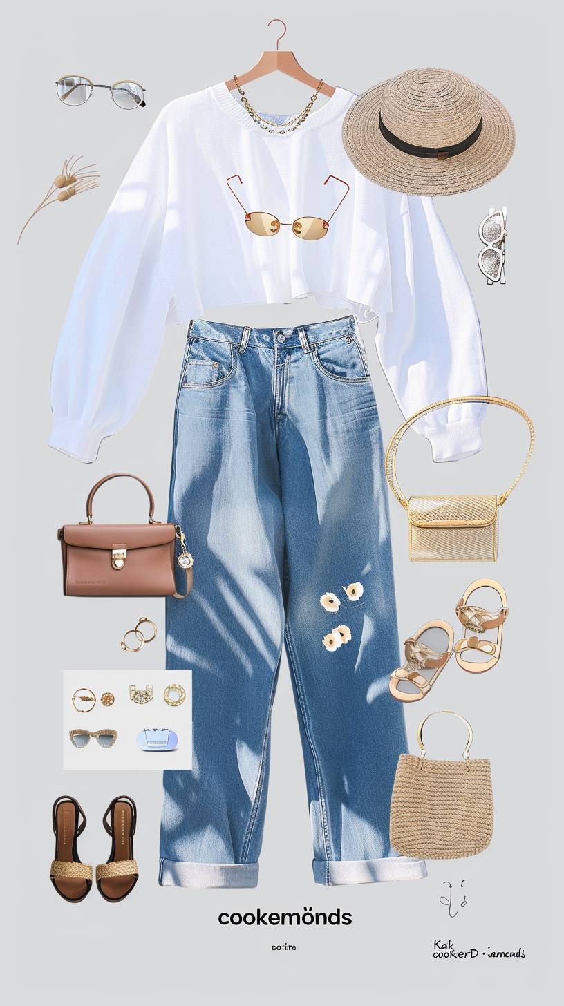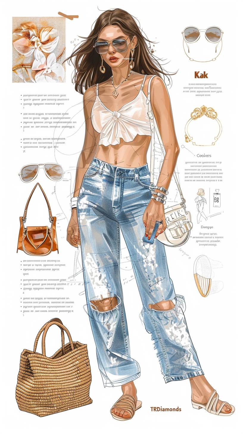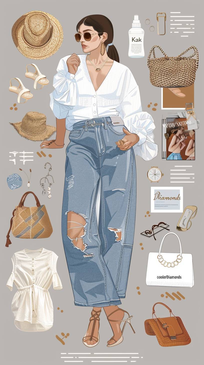 An Instagram story for the Russian fashion magazine "Kak cookerctrDiamonds" showing how to wear denim blue jeans with a white top, brown sandals and a beige straw bag on a light gray background. The title of the infographic should be written at the bottom in Russian language. In front there will also be one or more rings and earrings in a golden color. On both sides you can see different accessories such as a handbag and watch. It's like a photo collage in the style of a fashion magazine. --ar 9:16 --v 6.0