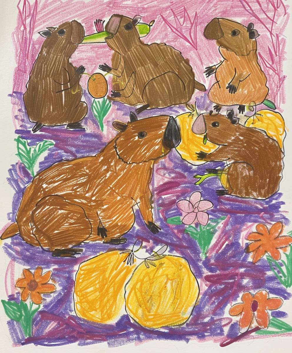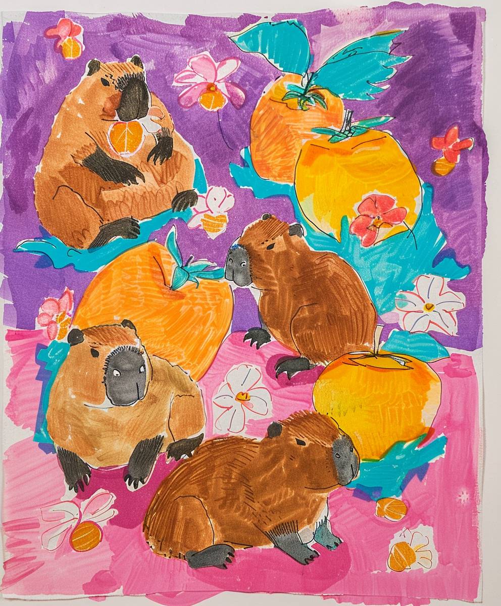 A child's drawing of several cute capybaras sitting on the ground in pastel colors, some capybaras are eating fruit and others have flowers around them. They look happy and contented. The background color should be purple, pink, and blue with two large yellow oranges. In the style of Henri Matisse. On top there’s one brown line drawn capybara lying down. It looks like it was painted in the style of an eight year old girl. There’s a white paper border surrounding all sides of the painting.
