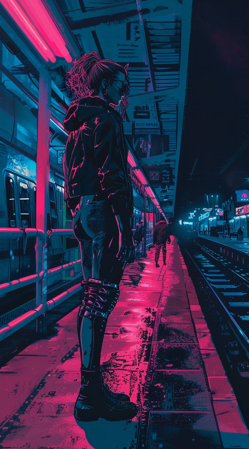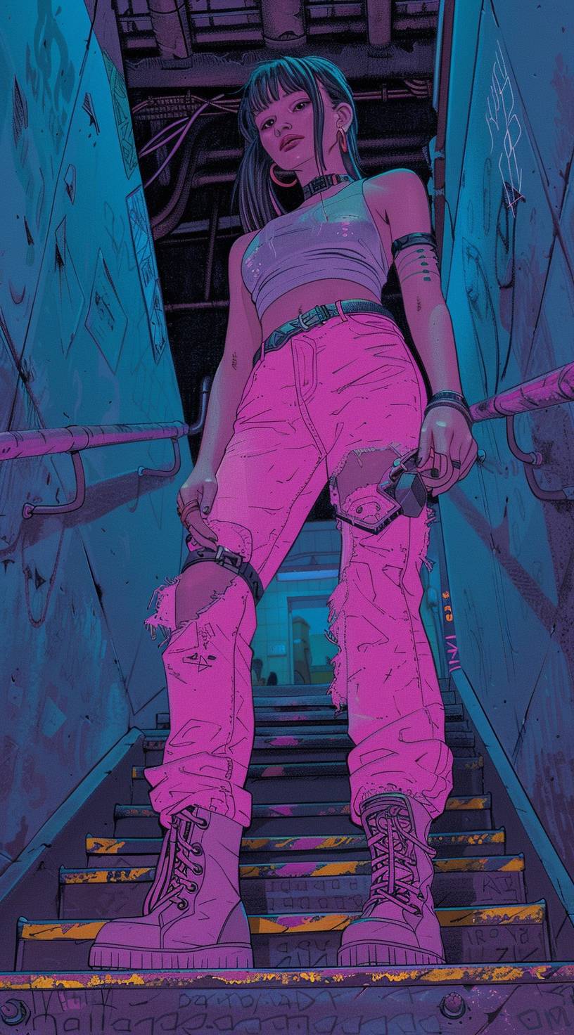 A lady in a technicolor outfit standing in the gangway, in the style of cyberpunk manga, Josan Gonzalez, sky-blue and pink, strong sense of realism, transportcore, blink-and-you-miss-it detail, vaporpunk.