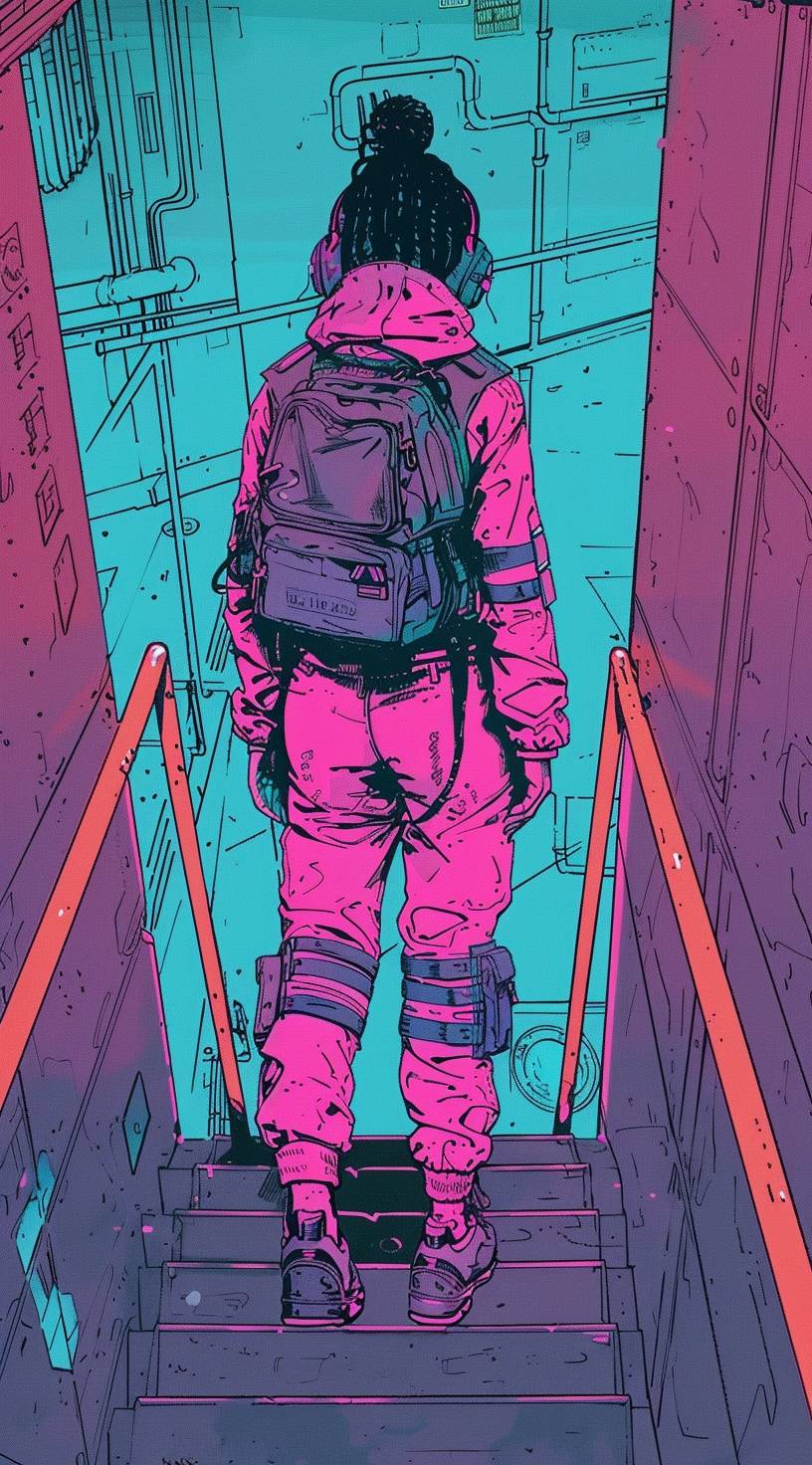 a lady in a technicolor outfit standing in the gangway, in the style of cyberpunk manga, josan gonzalez, sky-blue and pink, strong sense of realism, transportcore, blink-and-you-miss-it detail, vaporpunk --ar 71:128 --v 6.0