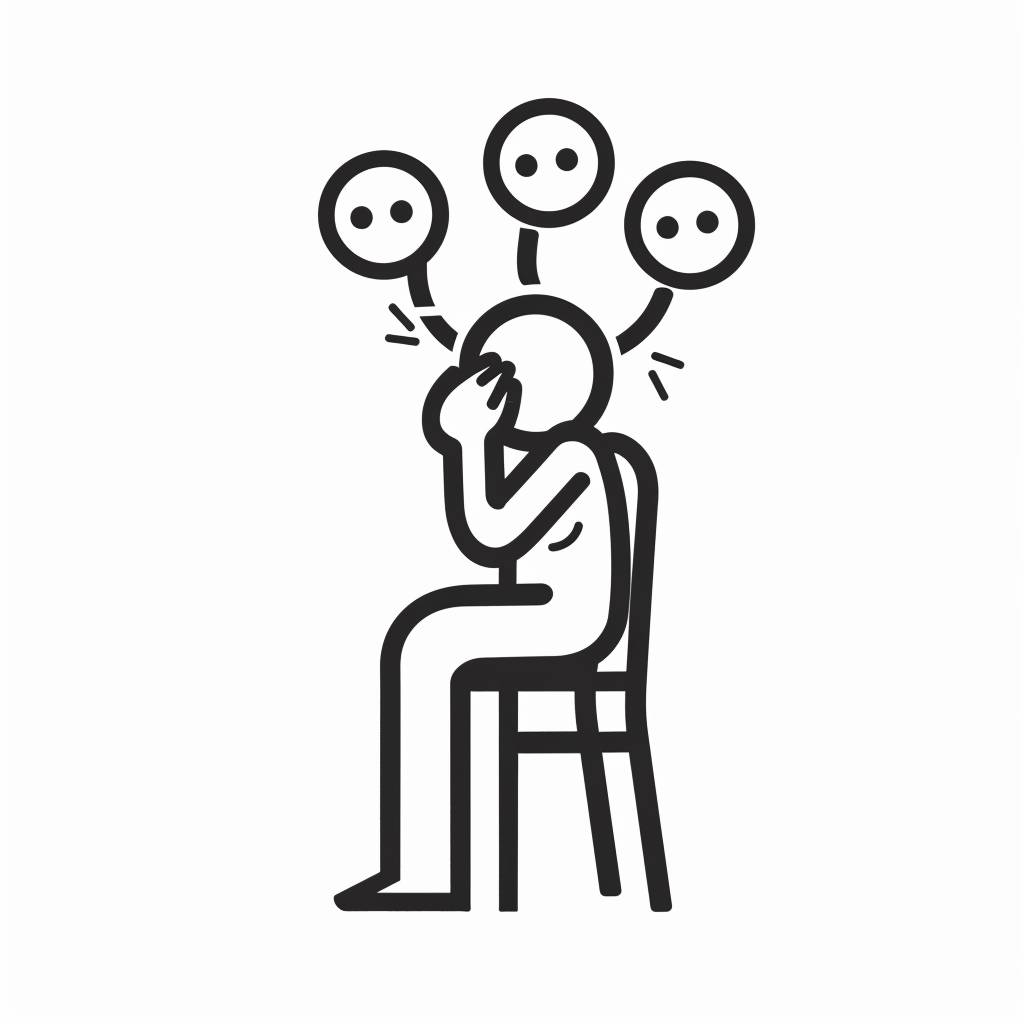 Bold, simple vector icon of a stickman sitting on the chair putting its hands on its face, overthinking with 3 bubble chats above its head, side profile, black line, white background --ar 1:1 --v 6.0