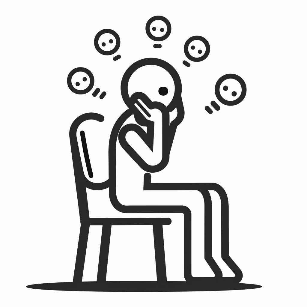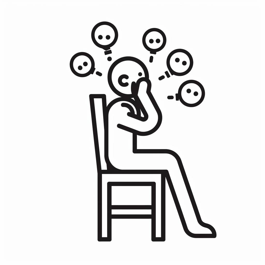 Simple vector icon of a stickman sitting on a chair, overthinking.