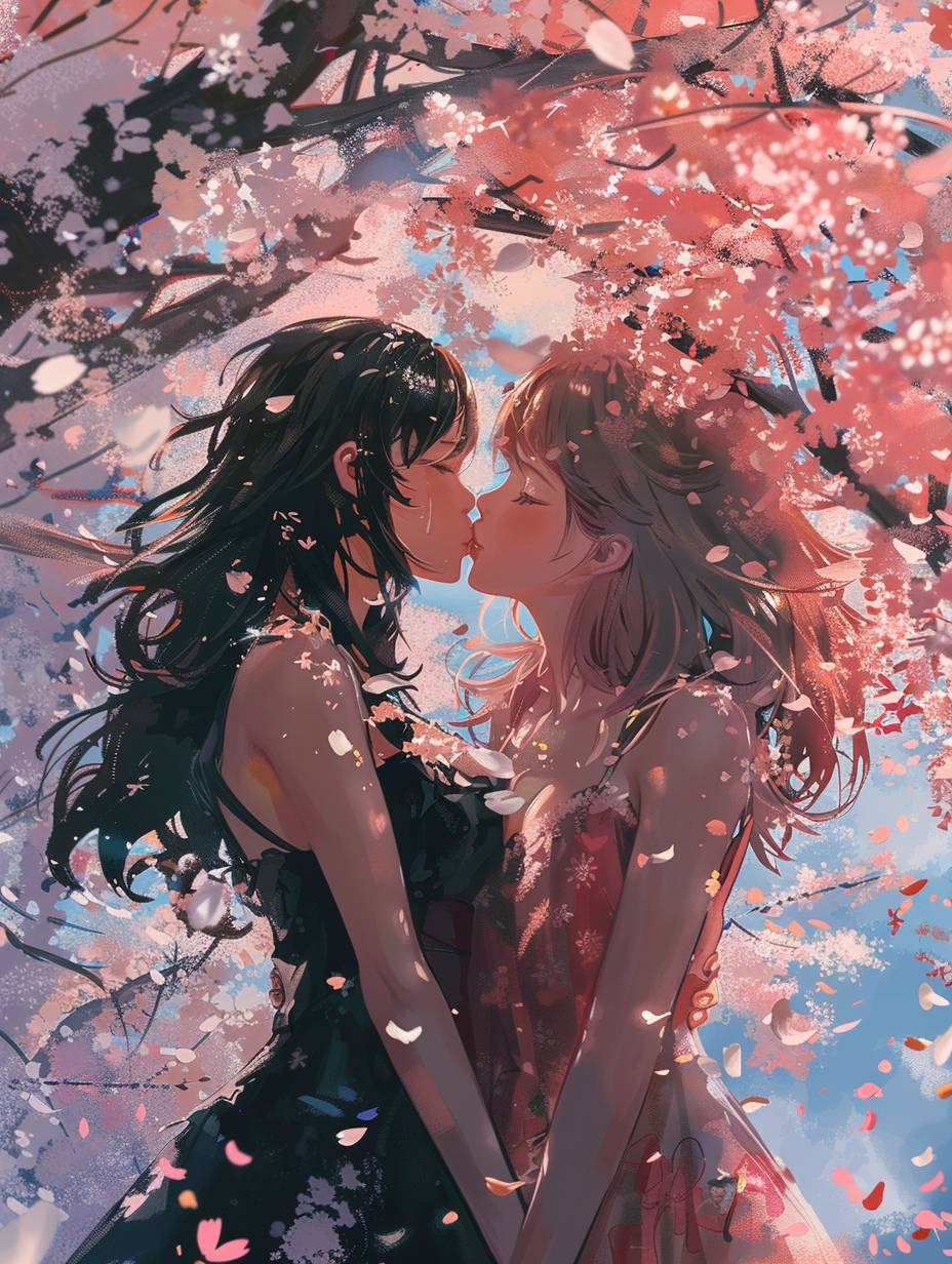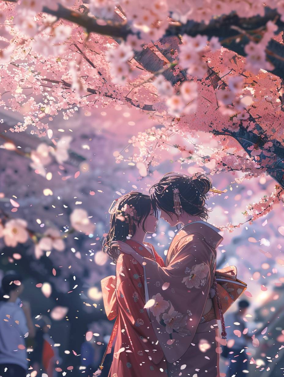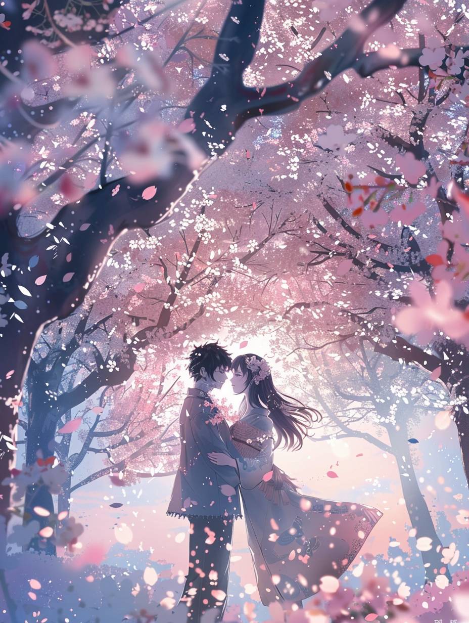 Two anime characters share a tender moment beneath a canopy of cherry blossoms in full bloom, petals drifting around them --ar 3:4 --v 6.0