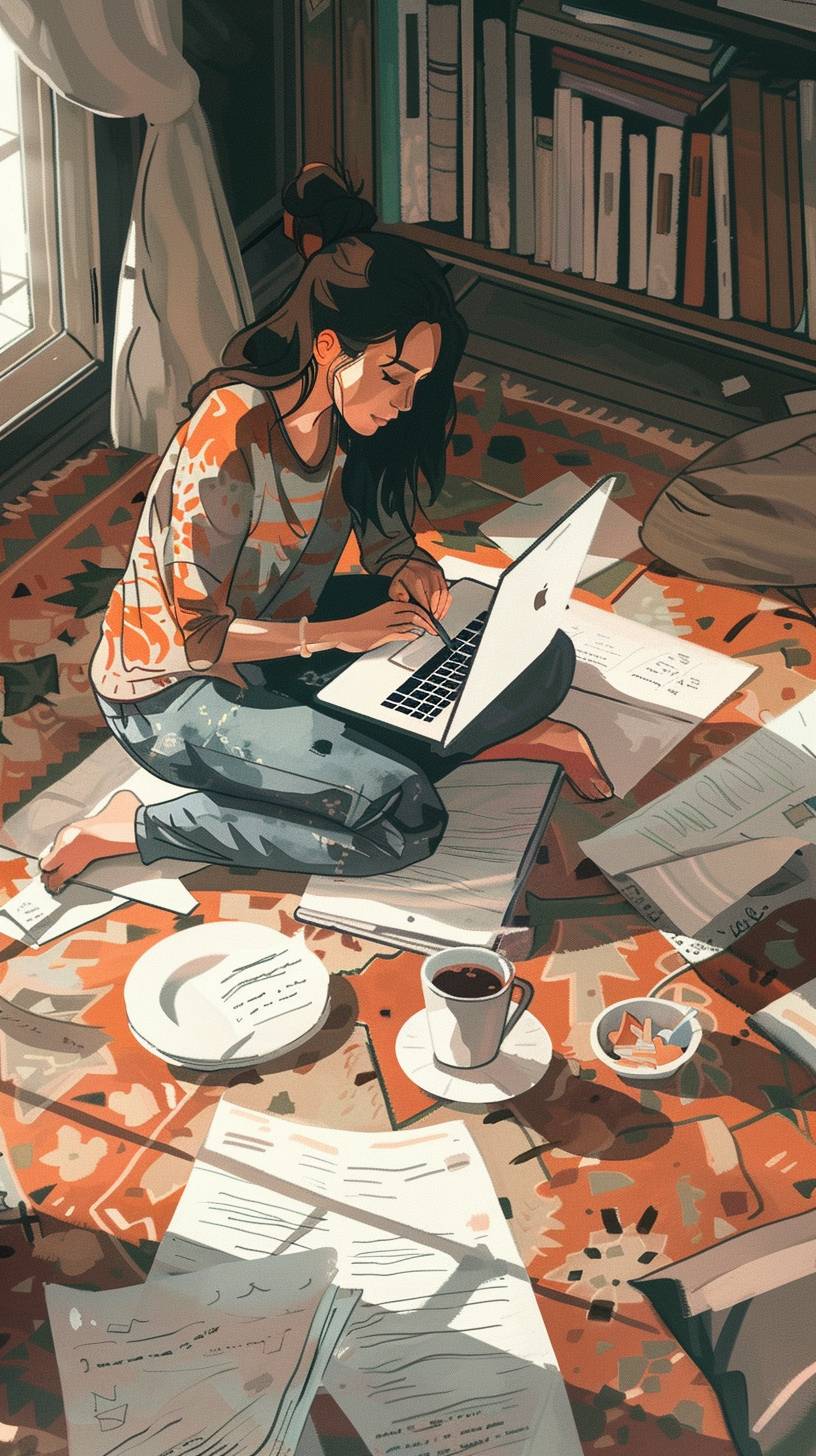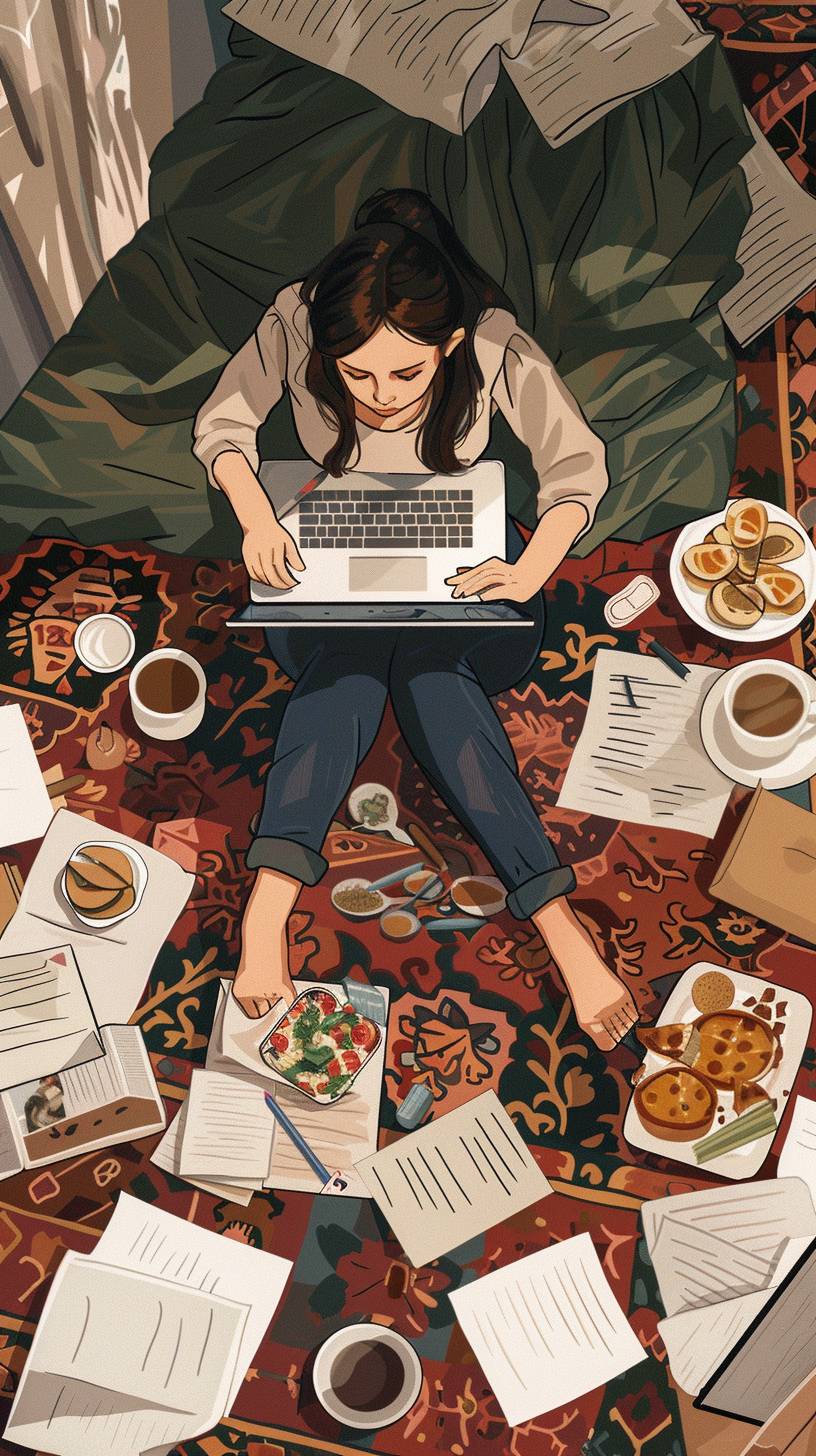 a girl sitting on a carpet with a laptop, writing an email, surrounded by papers, plates with leftover food, cups of coffee, illustration by Erzhe, 2d vector style --ar 9:16 --v 6.0