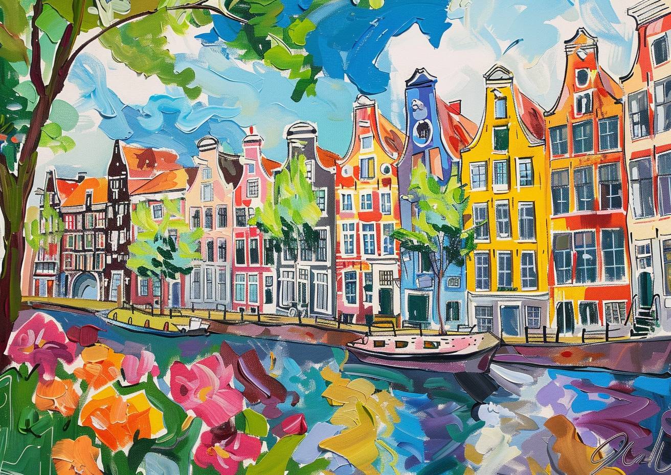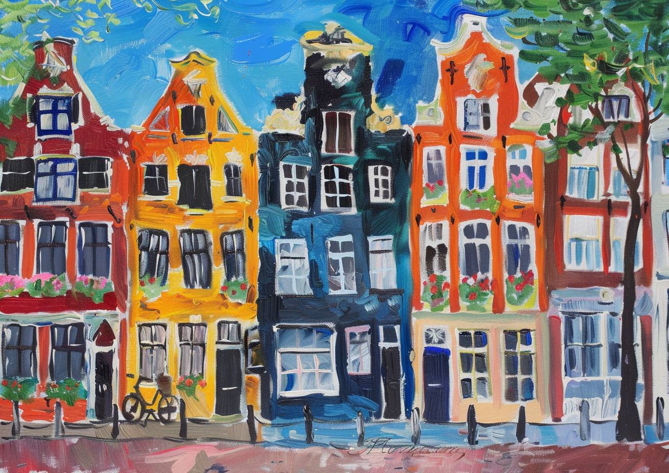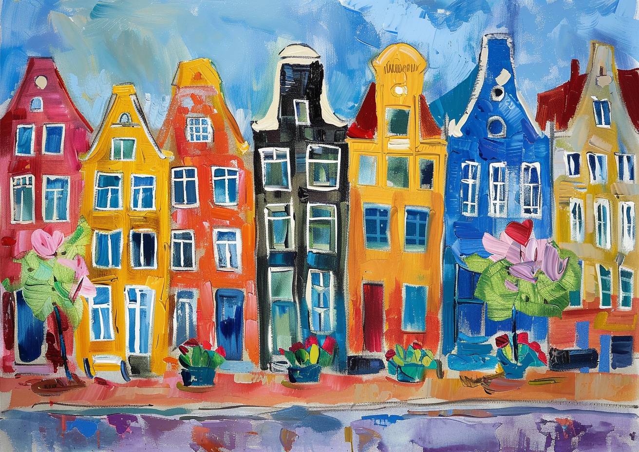 Colorful Shadow Sketch,Amsterdam, charming street lined with colorful townhouses, flowers, summertime, england, most unique naive art amazing painting by Sophie Blackall and Maud Lewis and chagall, amazing brushstrokes, sharp, high quality, masterpiece, ultrasharp, --ar 7:5 --v 6.0