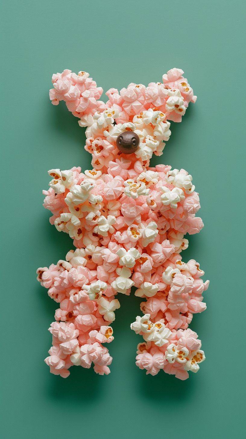 A top view of a pink popcorn dog set against a green background, highly detailed.