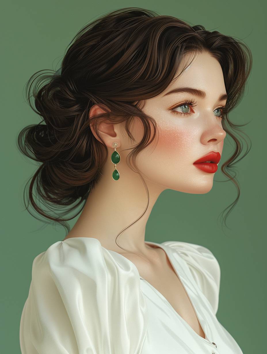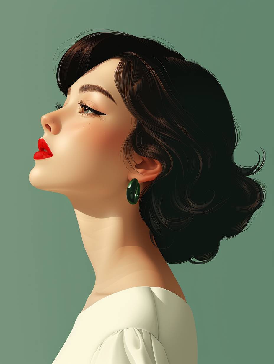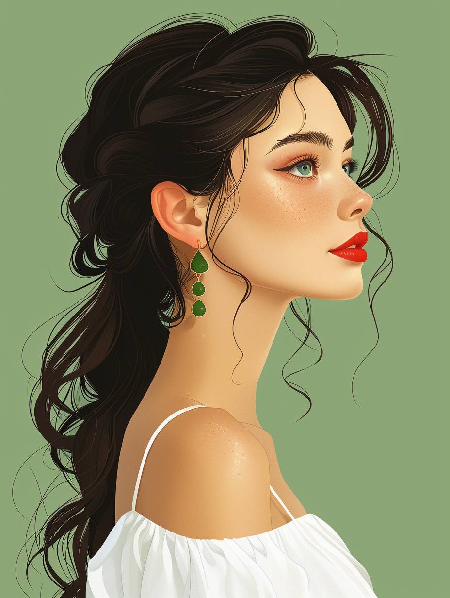 Flat illustration of a girl, background in avocado green, minimalist art, white dress, red lipstick, alluring gaze, green vintage earrings, profile view, soft lighting, muted tones, serene ambiance. --ar 3:4 --s 750 --v 6.0