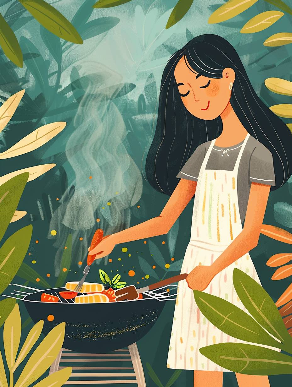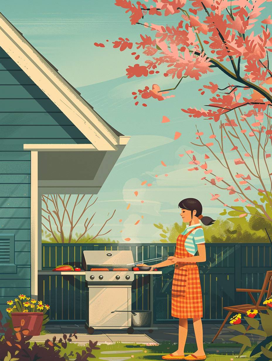 spring poster, an Asian girl cooks on the grill outside in the backyard patio, cartoon, 2D, bright spring pastel colors, flat lines --ar 3:4 --s 200 --v 6.0