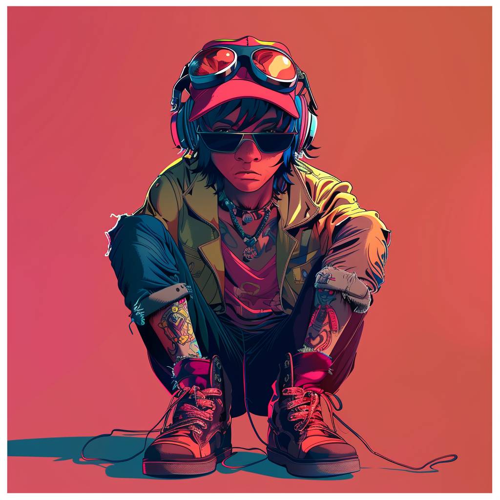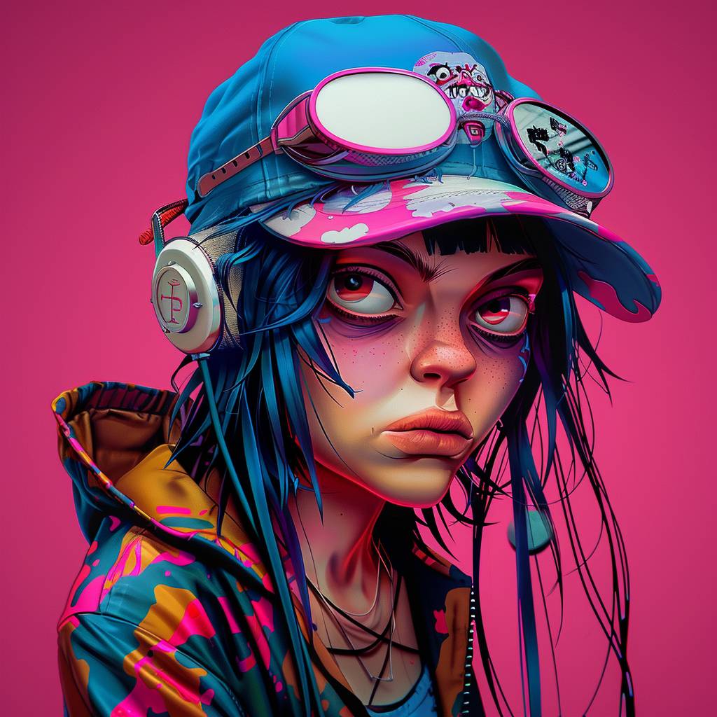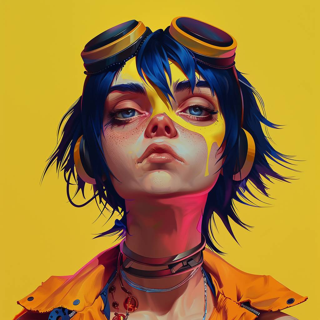 Editorial portrait of [name] in the style of Gorillaz illustration, vivid colors, dynamic composition. Detailed hyper-realistic outfit, pop culture, gadgetpunk.