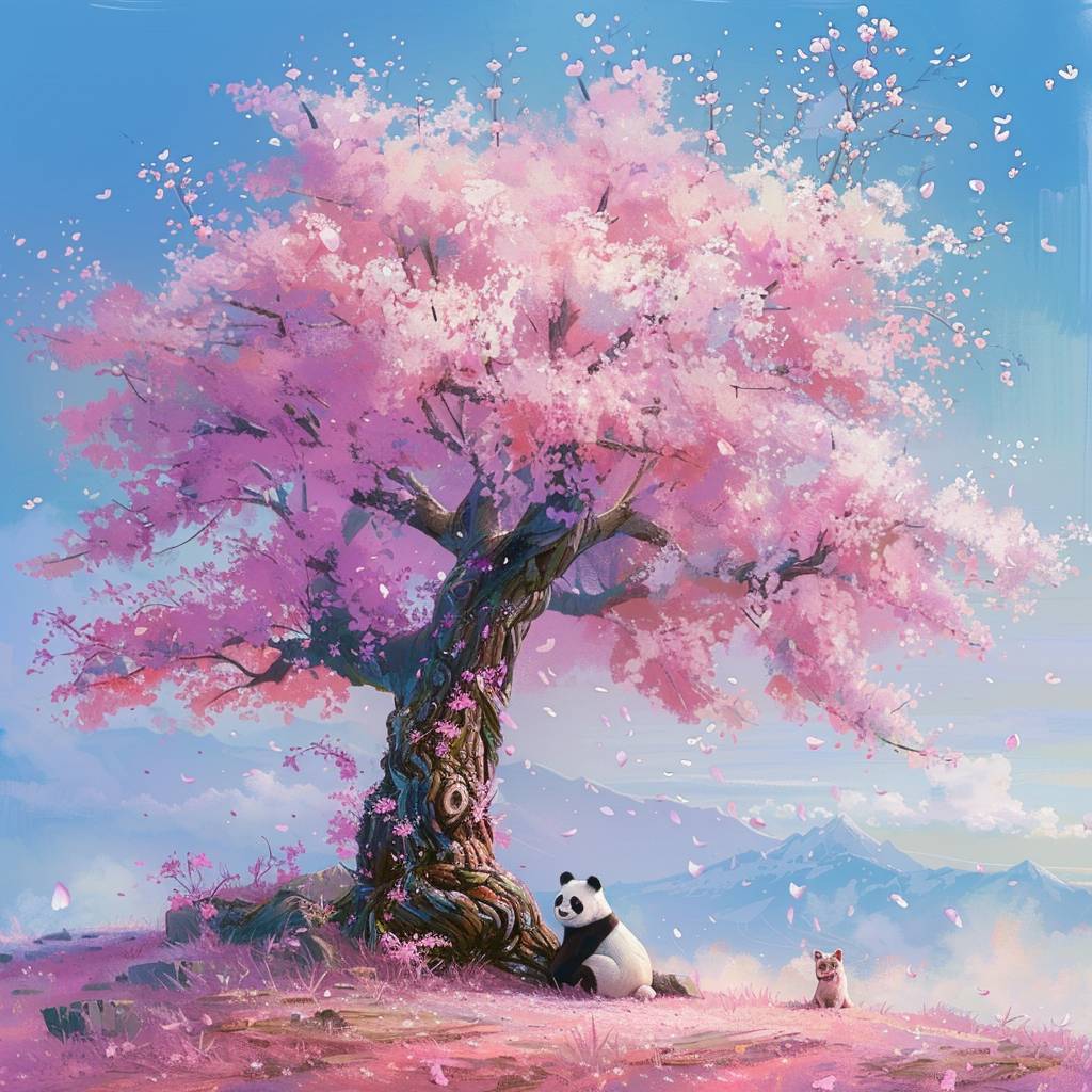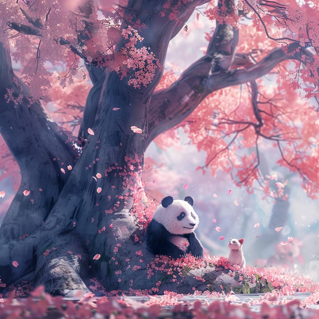 Under a huge cherry blossom tree, there is a lonely elderly panda and dog and cat, with cherry blossoms on the ground. The feeling of light and spring, the artistic conception of beautiful movies, surreal style, high quality, high-definition, film, and minimalist background --v 6.0