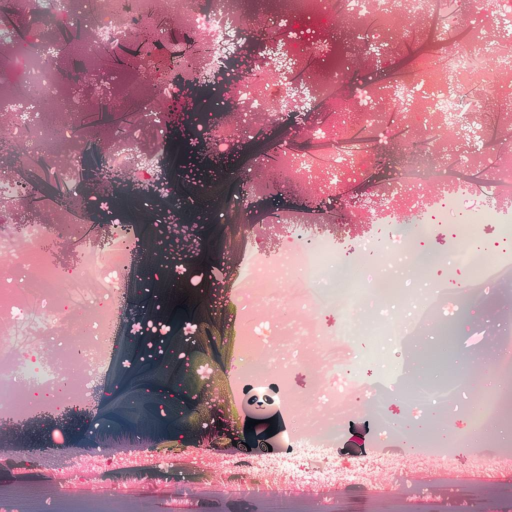 Under a cherry blossom tree, a lonely elderly panda, dog, and cat.