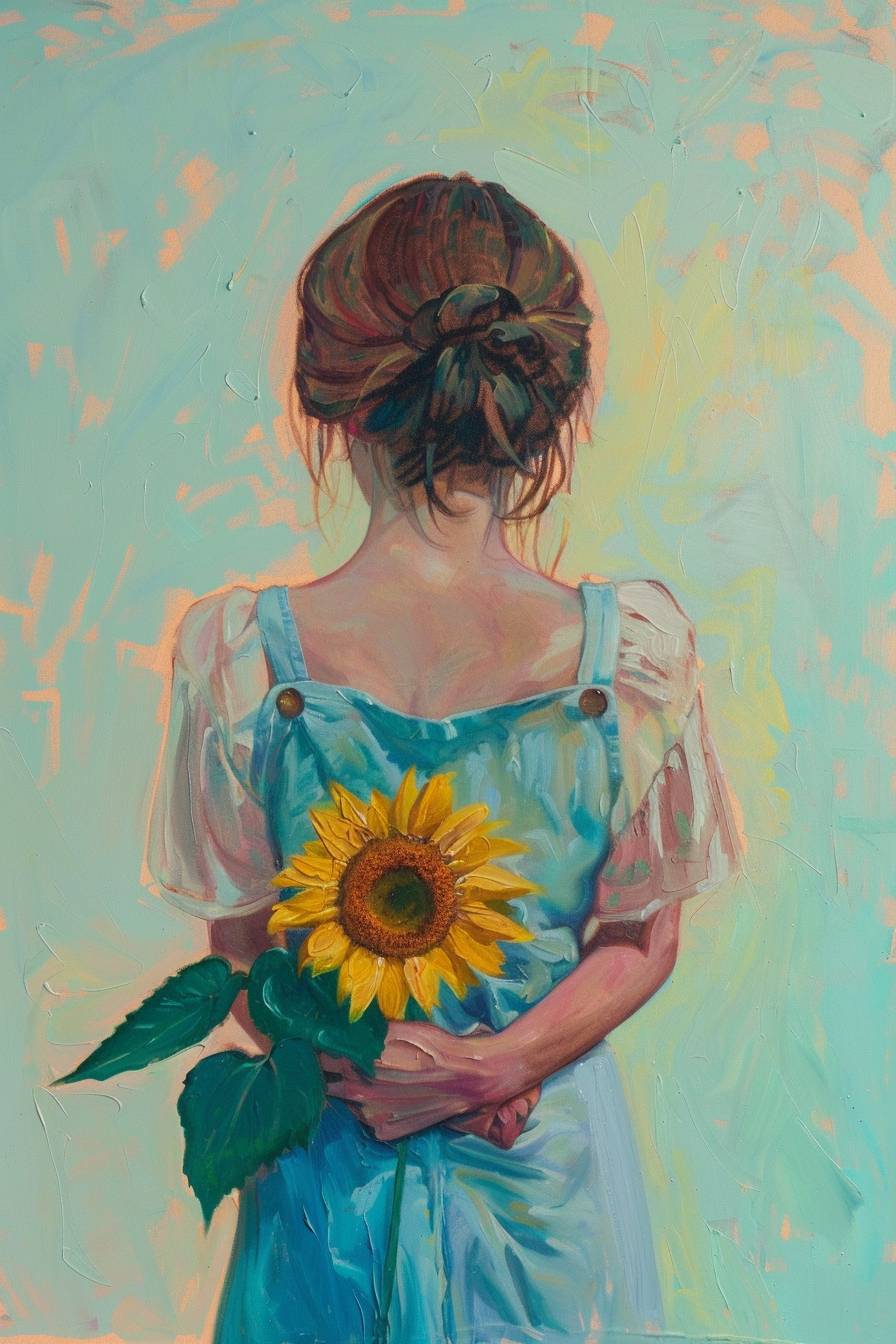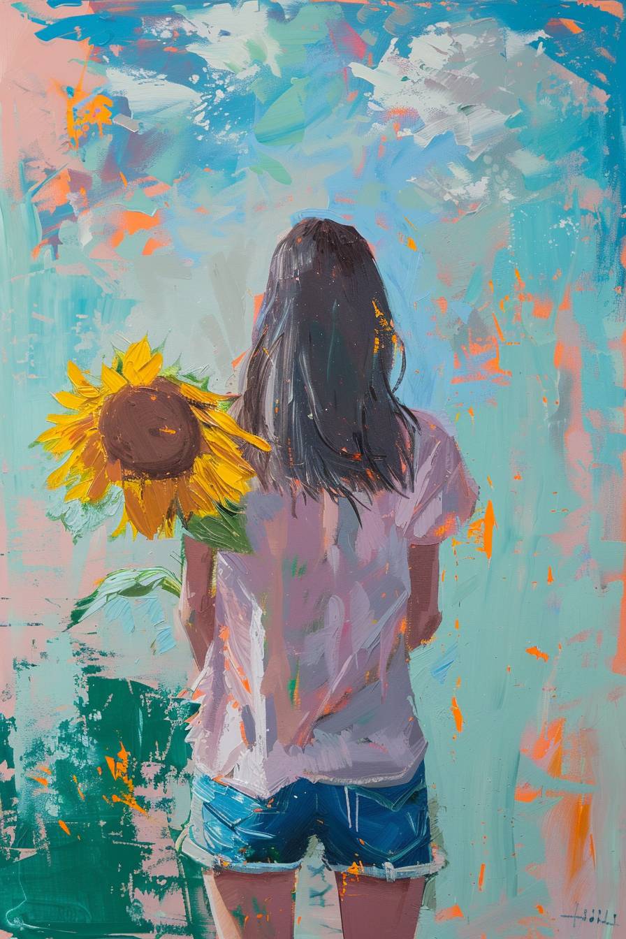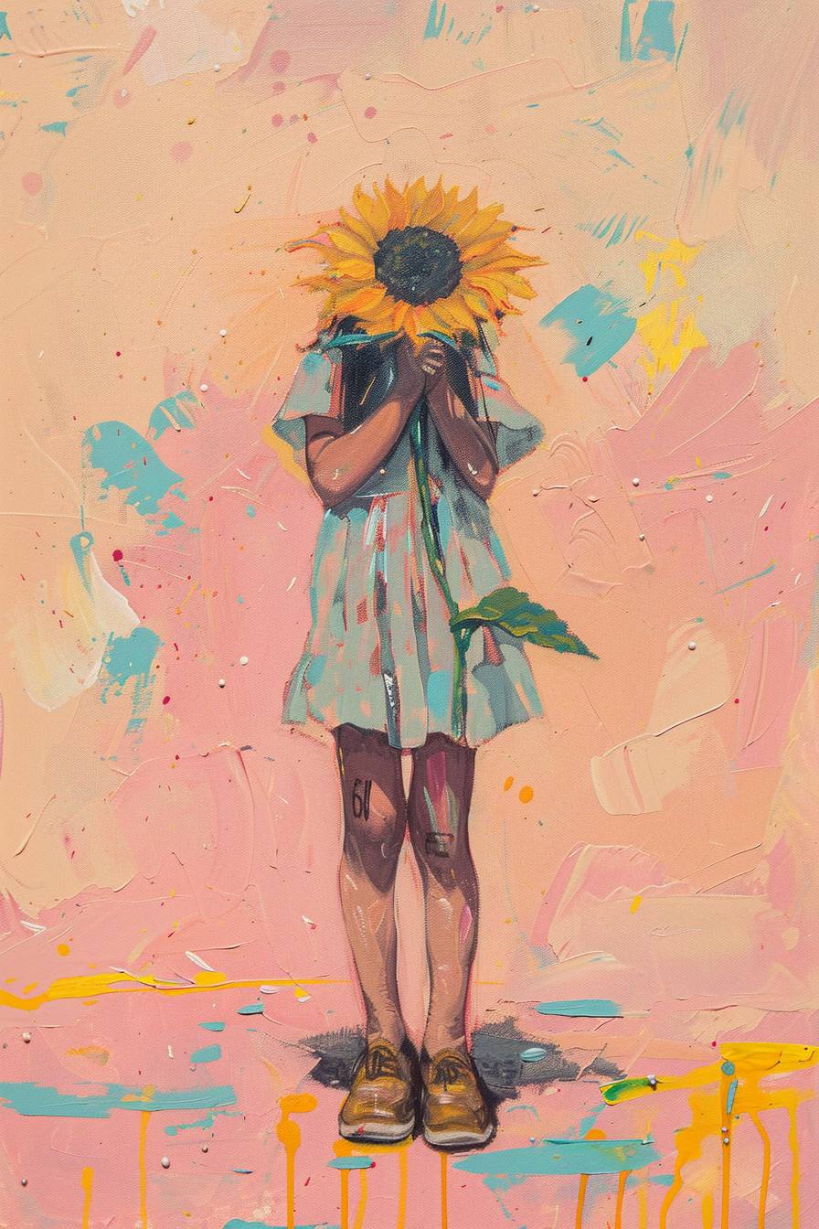 Minimalistic surreal painting of a girl with a sunflower