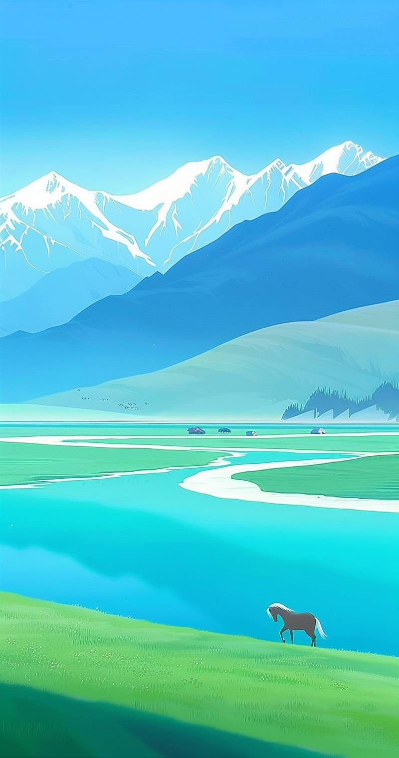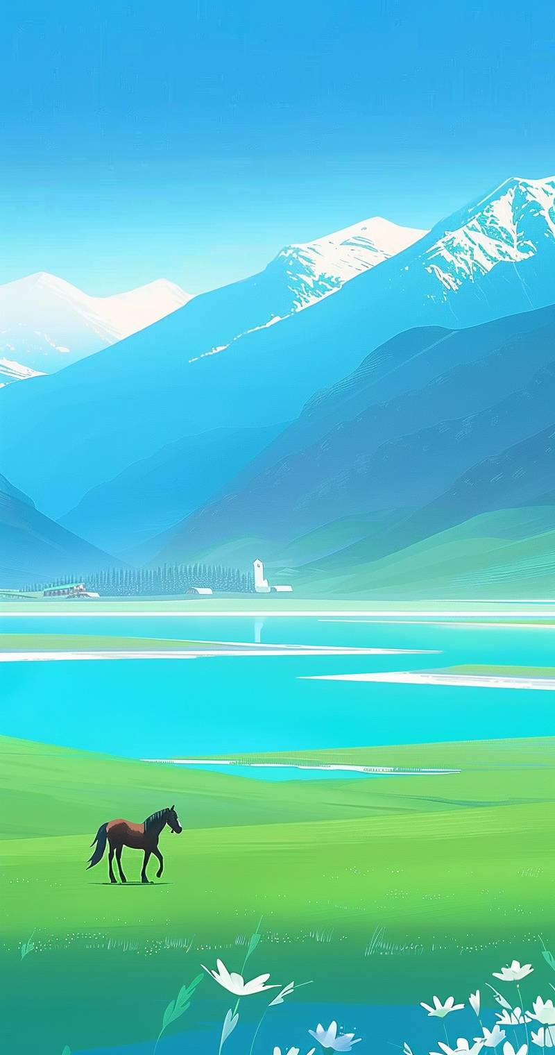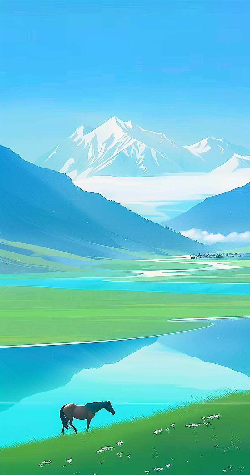 <https://s.mj.run/kjEZIws1udE> In the spring, there is green grass on both sides of the river with snowcapped mountains in the distance and a clear blue sky. A horse walks alone by the lake, surrounded by vast meadows and distant villages. The flat illustration style creates an atmosphere full of vitality. It uses bright colors to highlight fresh natural scenery. In closeup shots, you can see that it presents delicate lines and soft lighting effects. This scene seems like a picture drawn from nature itself, in the style of nature itself. --ar 9:17 --sref <https://s.mj.run/XALtAEAFCV0> --v 6.0