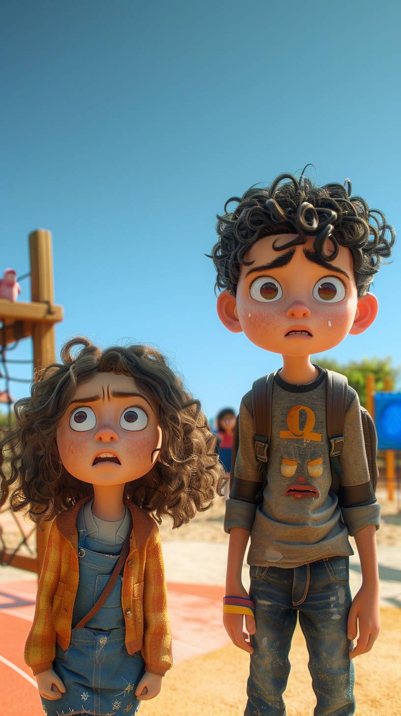 Long distance wide angle view, front view of a brave girl standing in front of a sad young boy. The boy has a very round curly haircut. At the playground at school, cartoon characters, in the style of 3D Disney Pixar animation, 8K, 3D style, 3D art.