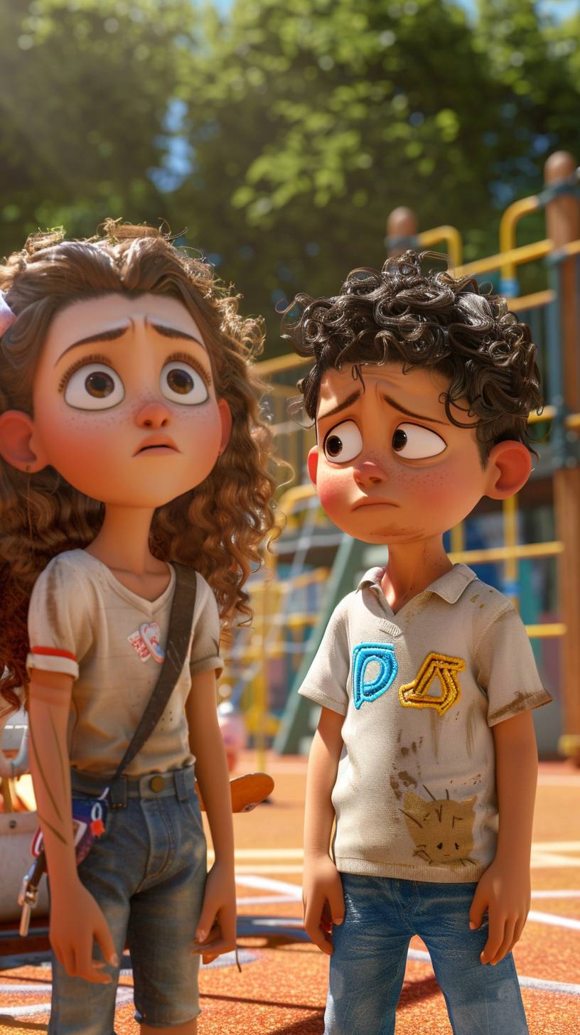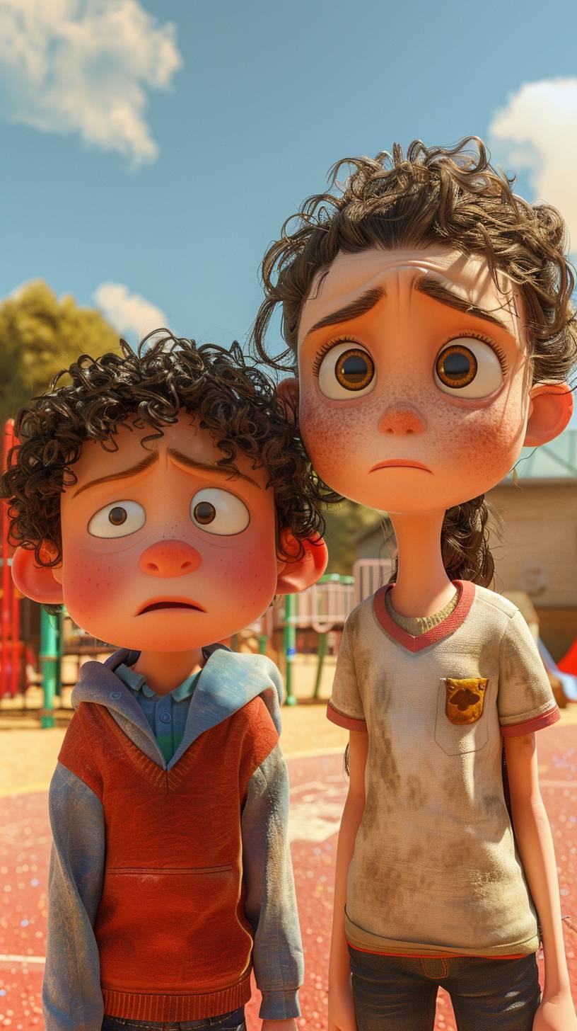 long distance wide angle view, front view, a brave girl, stand in front of a sad young boy, the boy has very round curly haircut, at the playground at school, cartoon characters, in the style of 3d Disney Pixar animation, 8k, 3D style, 3d art, --no beard mustache --ar 9:16 --stylize 200 --v 6.0