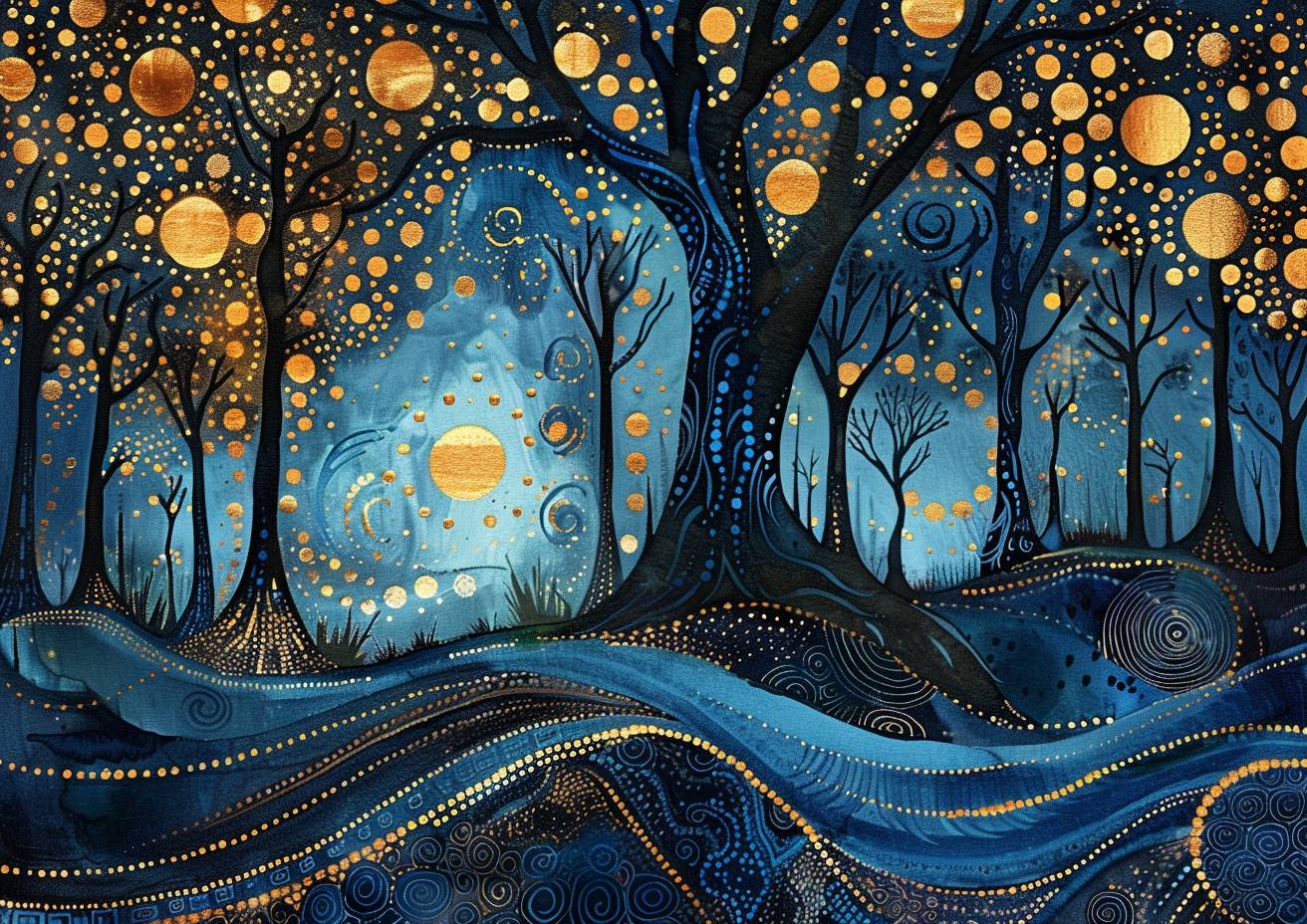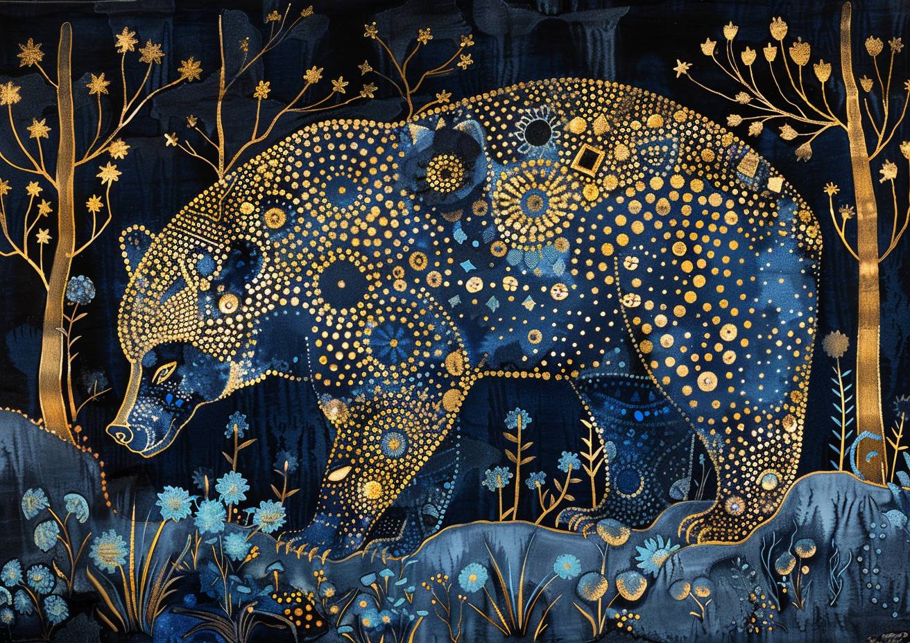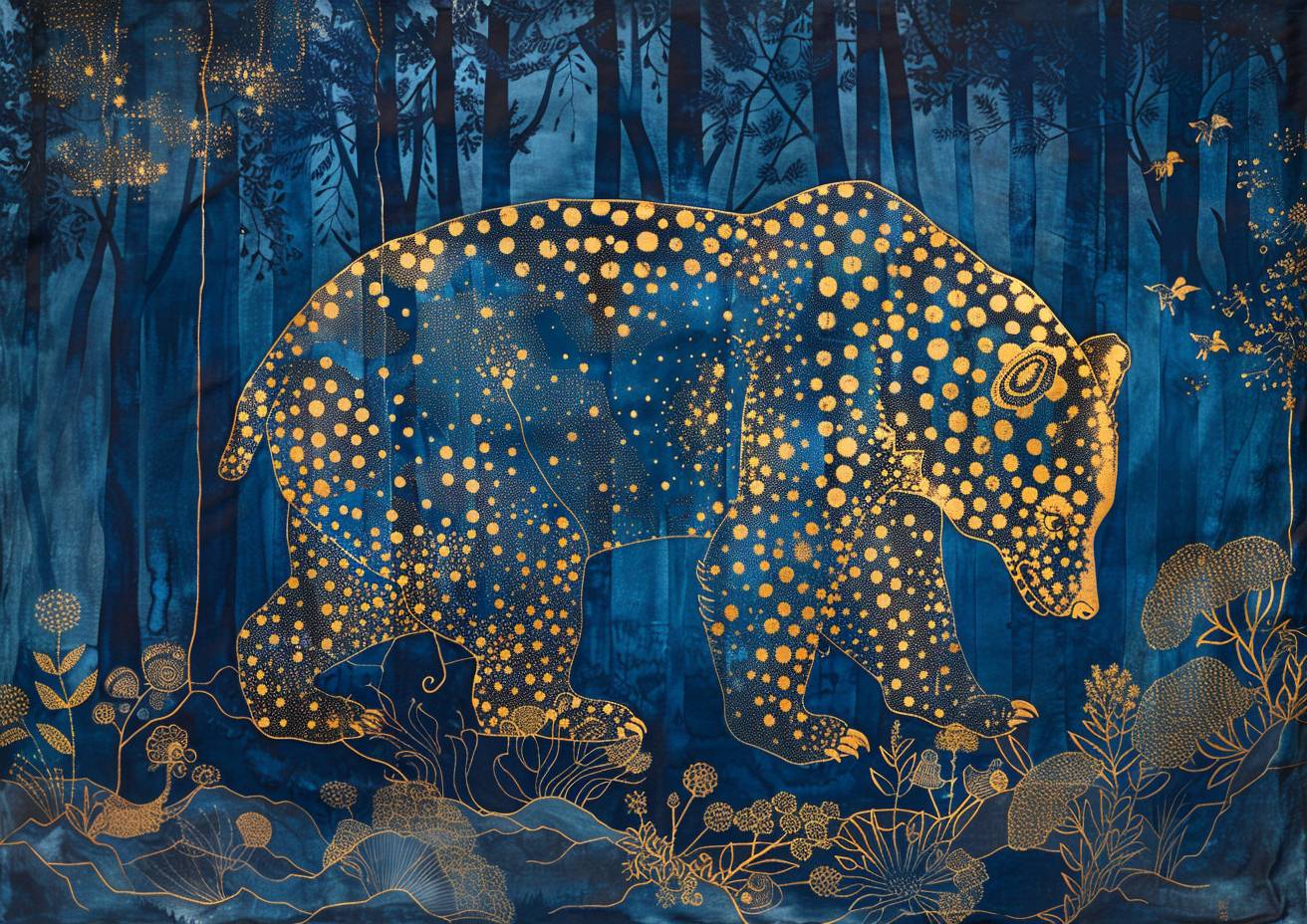 Ink wash painting on batik silk, a mighty bear in an enchanted forest, formed from phosphor dots in gold and blue, in the style of Gond art, intricate details, tenebrism, glowing radiant colors, strong visual flow.