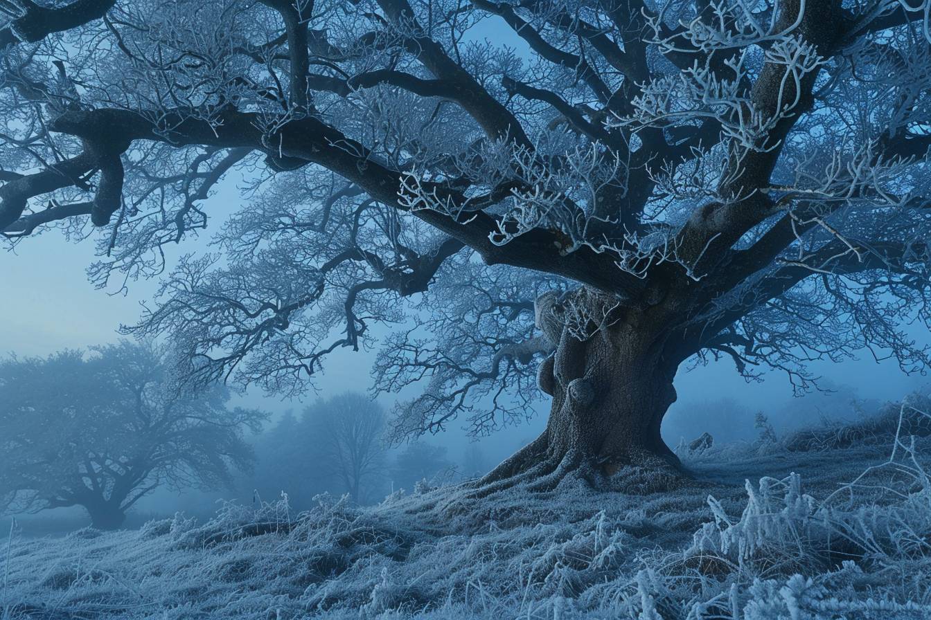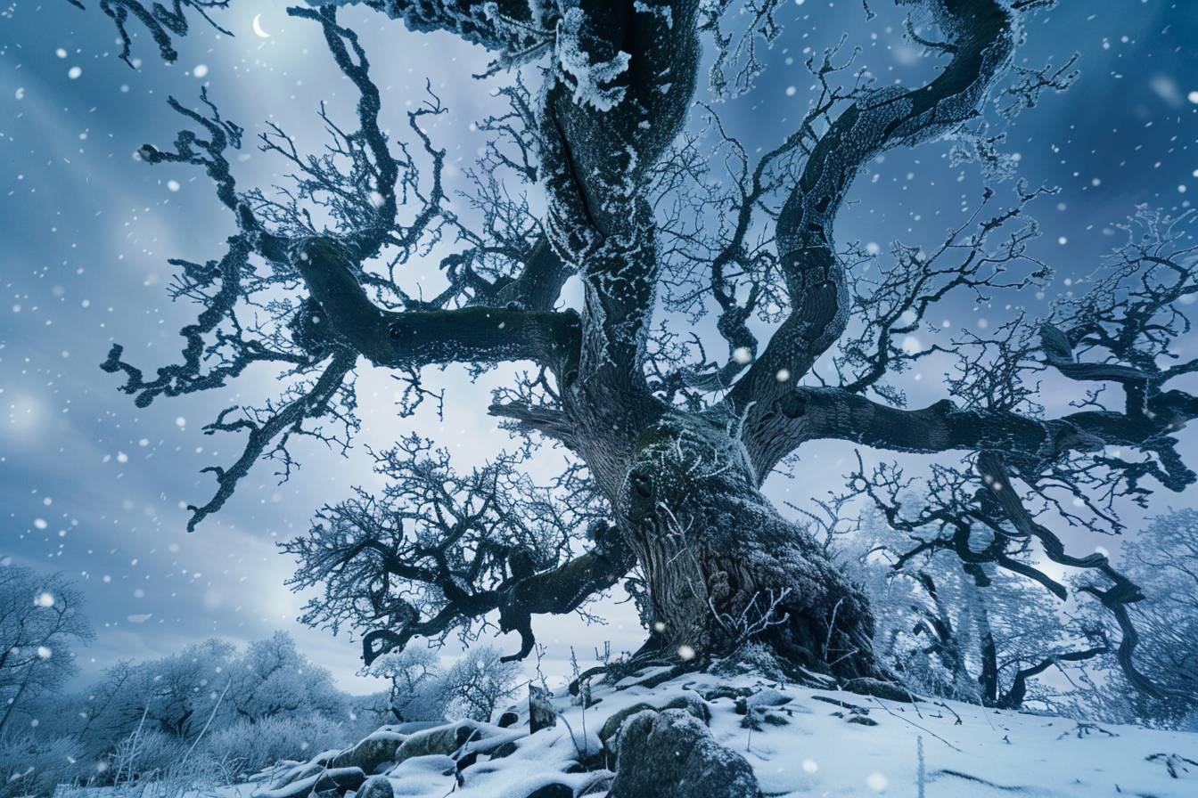 The ancient oak in 'Flickering Frost', frozen in time, captured by the moonlight, white raw, untamed, and the sapphire unyielding force of a cold, icy blizzard.