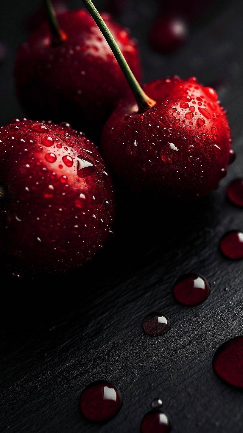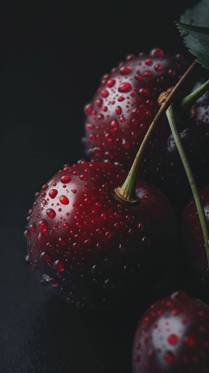 Water droplets on red cherries against a black background, reflecting dark silver and dark maroon styles, blending photorealism and minimalism.