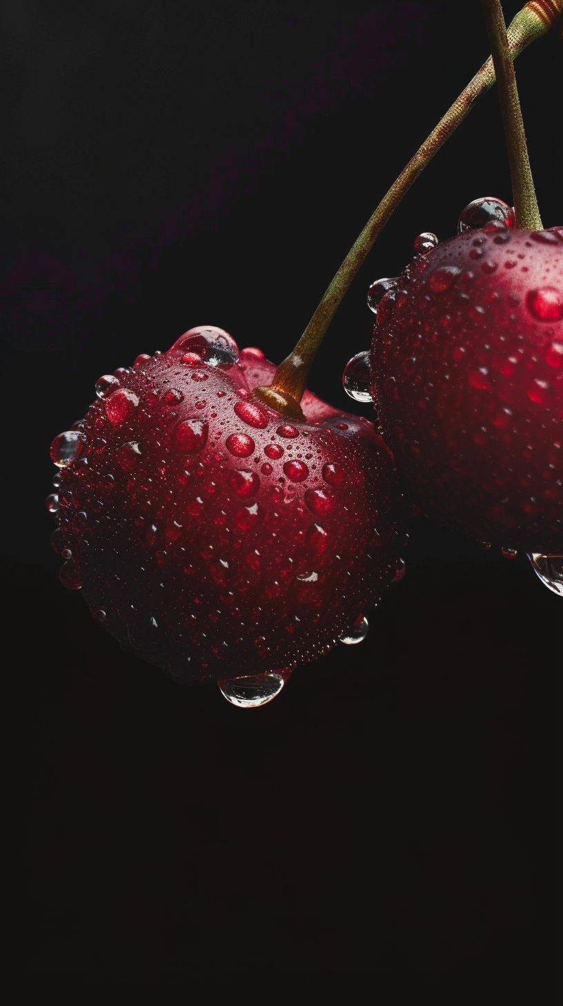 water droplets on red cherries, black background, in the style of dark silver and dark maroon, applecore, associated press photo, berrypunk, dark red, oshare kei, photorealism, minimal, good vibes, dark color backgrounds, minimalist, minimalistic --ar 9:16 --v 6