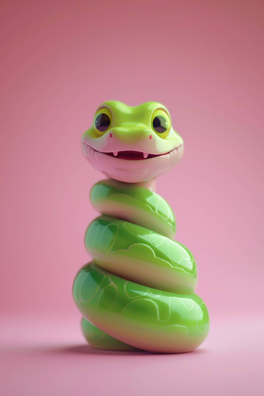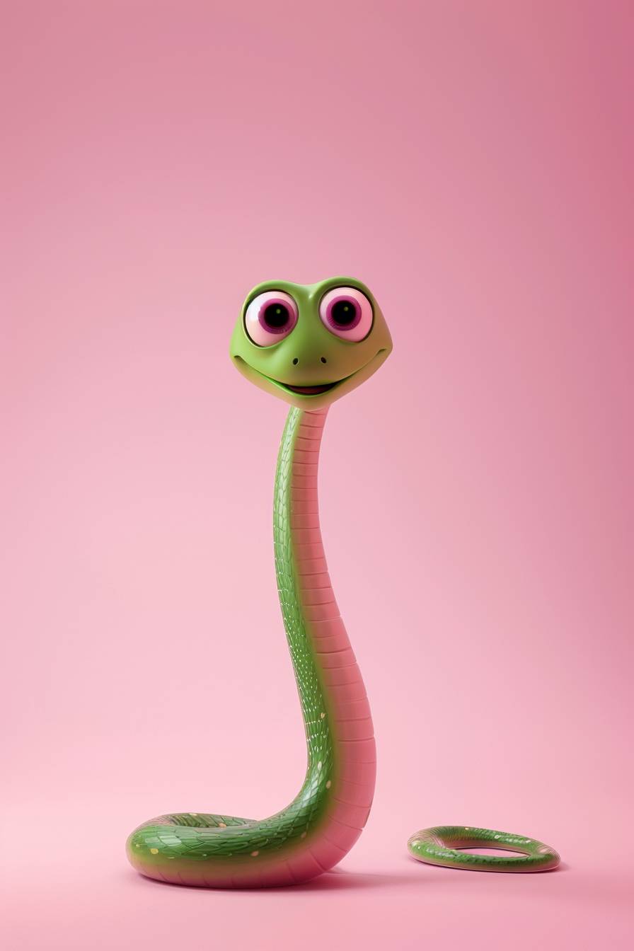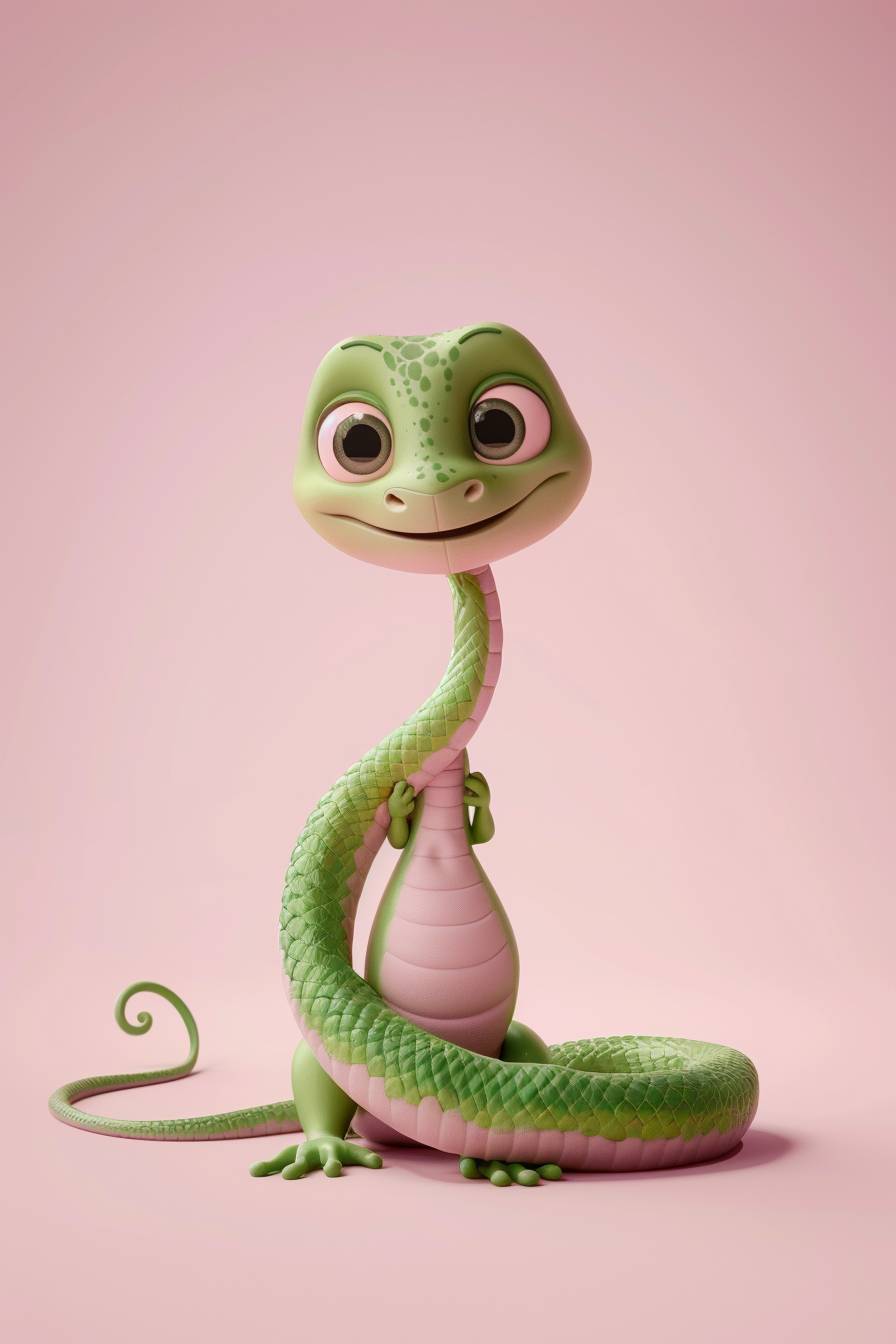 a cute small Joyful a pink green snake, with a happy expression. Pixar animation style, The background of the ID photo is pink, with a half side composition. Standing, the whole body is centered, hard light, strong light sense, c4d, 8k, high-definition quality --ar 2:3 --stylize 50 --v 6.0