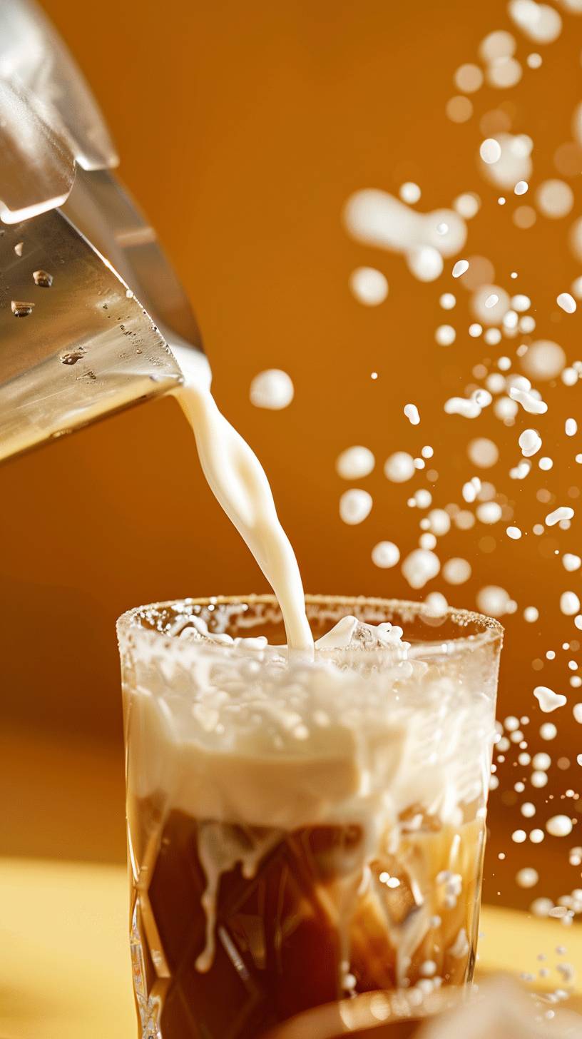 a close-up of milk being poured from a small stainless steel milk frother jug onto an iced coffee. the background is a yellow wall, it's bright daylight. the image style is modern and minimalist, yet it looks refrehsing and appetizing. --ar 9:16 --v 6.0