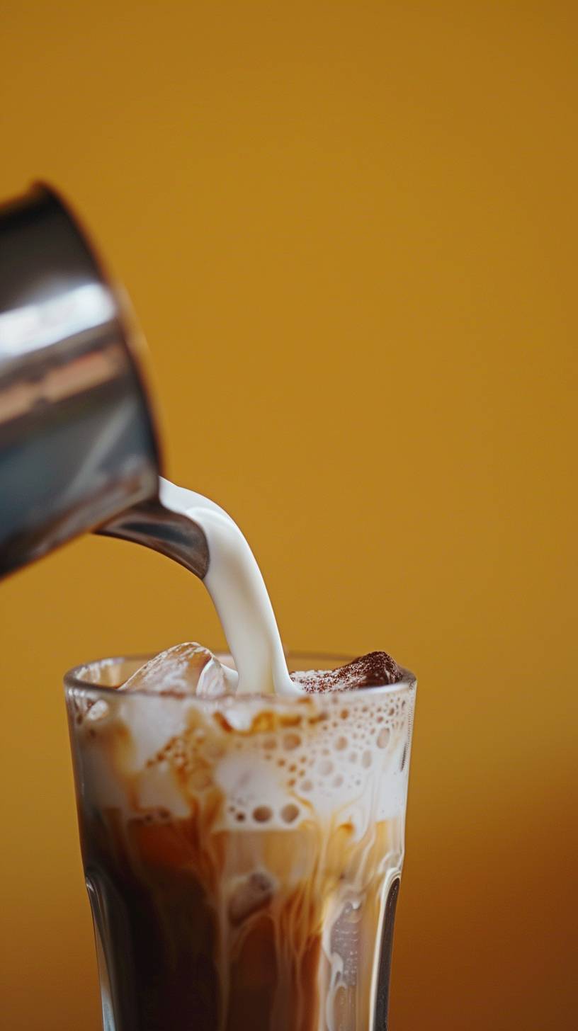 A close-up of milk being poured from a small stainless steel milk frother jug onto an iced coffee. The background is a yellow wall, it's bright daylight. The image style is modern and minimalist, yet it looks refreshing and appetizing.