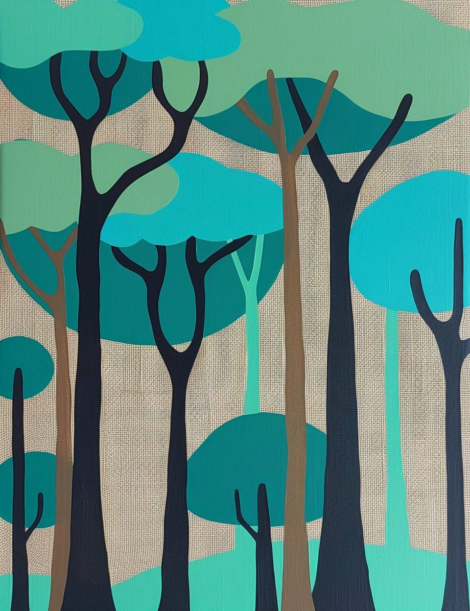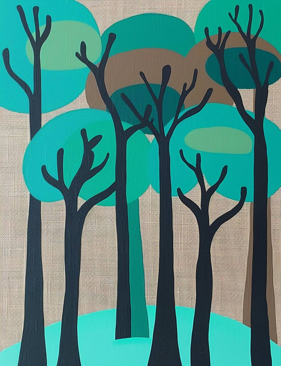 A simple painting of tall trees in mid-century modern style with aqua green and brown tones on burlap background.
