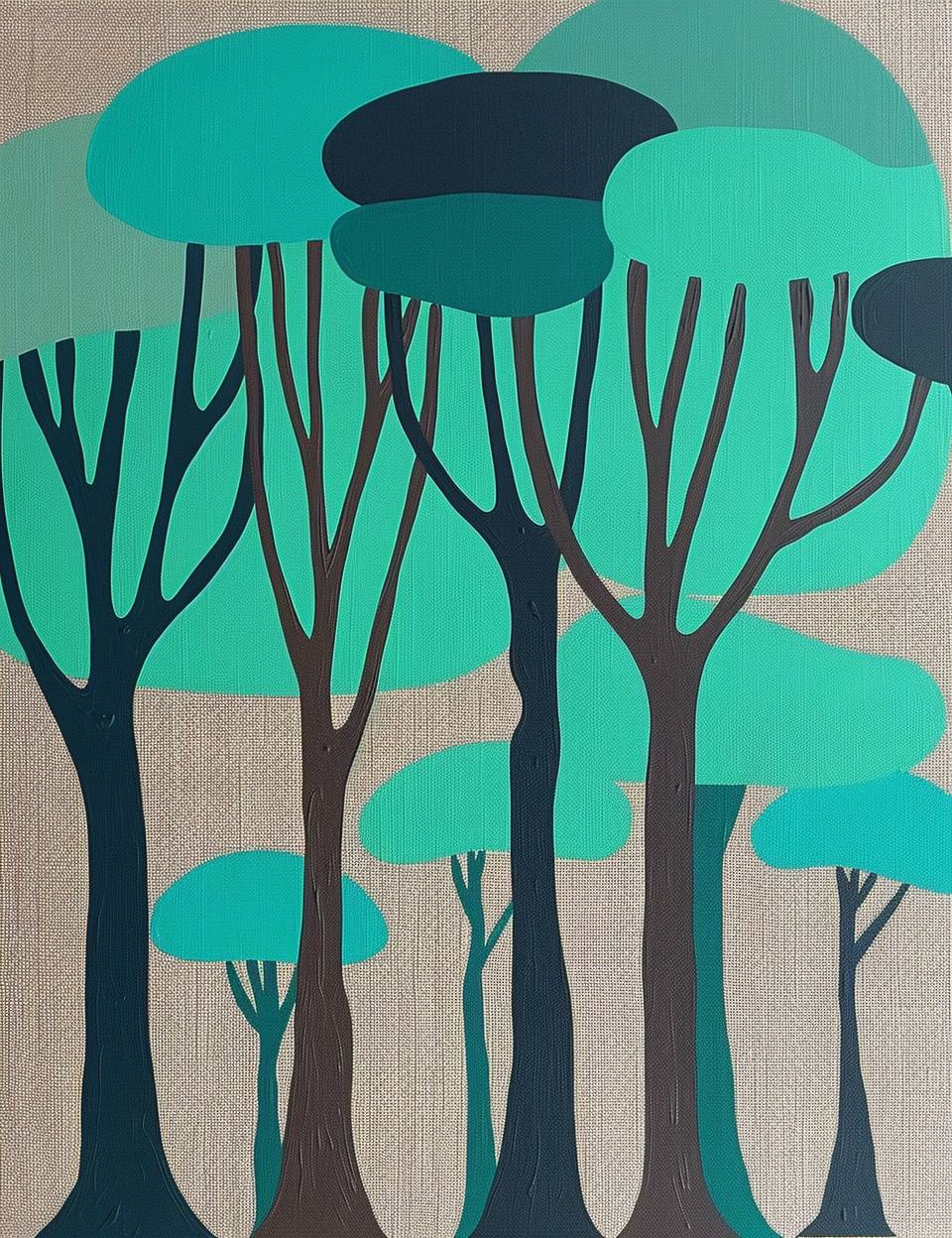 <https://s.mj.run/uAp2iDTFQsA> A simple painting of tall trees in the style of mid century modern, with aqua green and brown tones, simple shapes, on a burlap background. --no beard --ar 10:13 --sref <https://s.mj.run/uAp2iDTFQsA> --sw 200 --v 6.0
