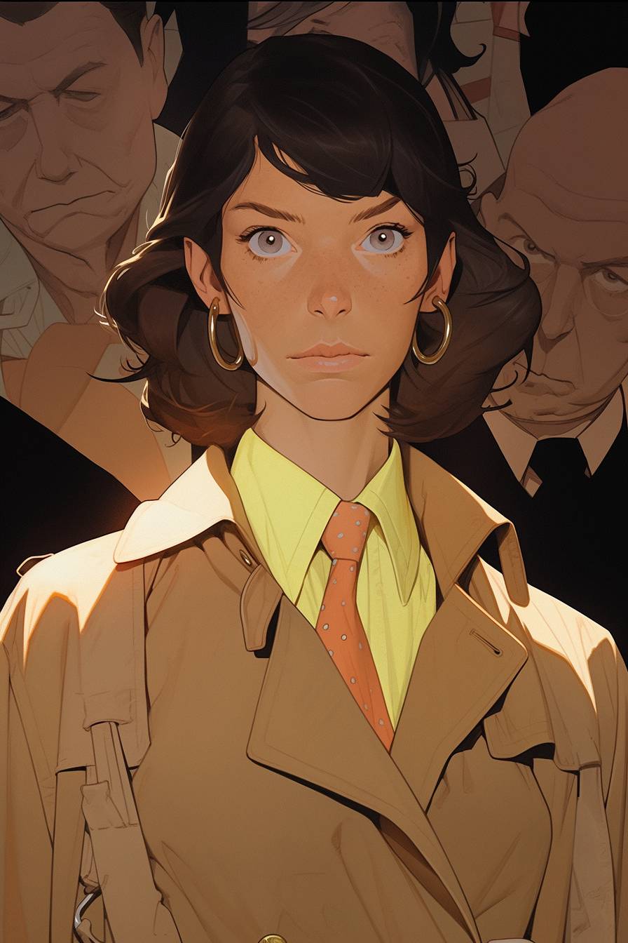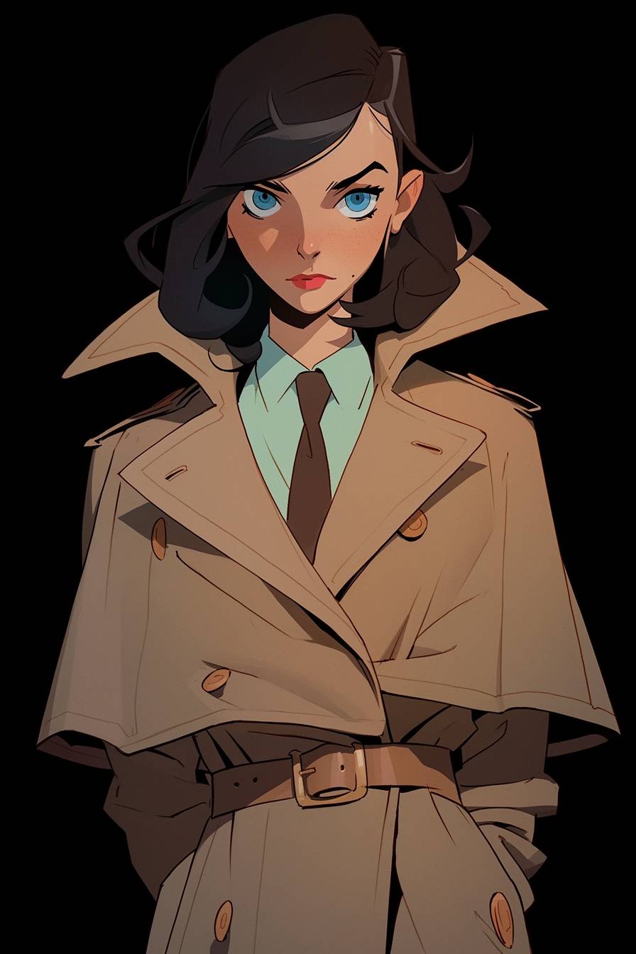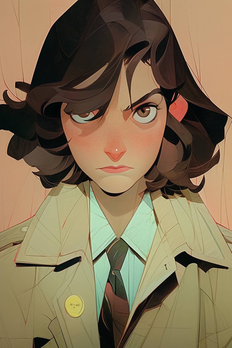 a confident woman detective with a sleek bobbed hairstyle cut and observant brown eyes, wearing a gray detective coat, is examining clues in a dimly lit crime scene, half-body:: portraited, face drawn by the masterful artist Wes Anderson, detailed, against a gritty background --ar 2:3 --niji 5 --style expressive
