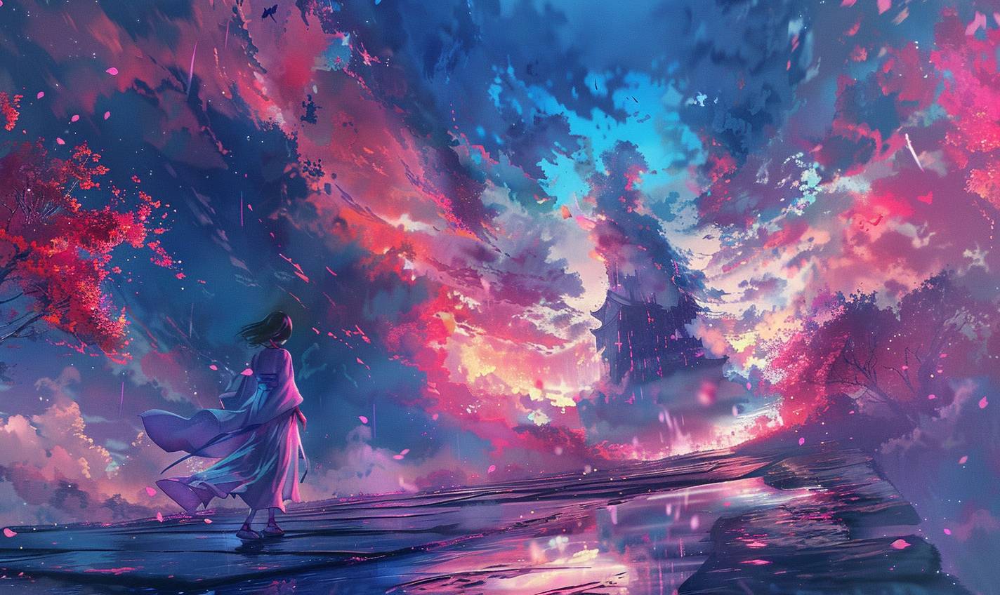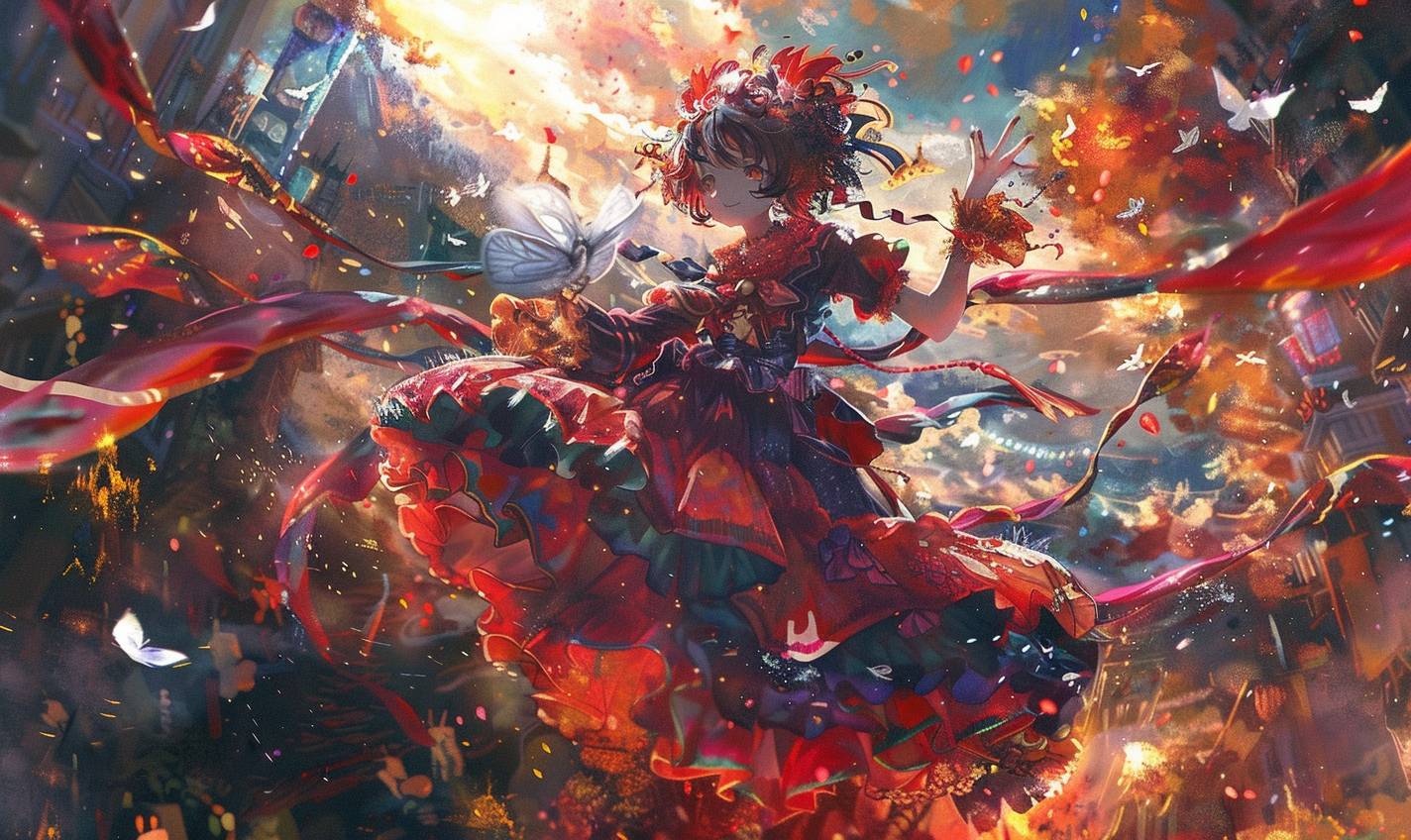 A [subject+clothes], [action], a [background], wide shot, vivid colors, anime art style, full body shot, front shot, fantasy atmosphere, 8k, highly detailed