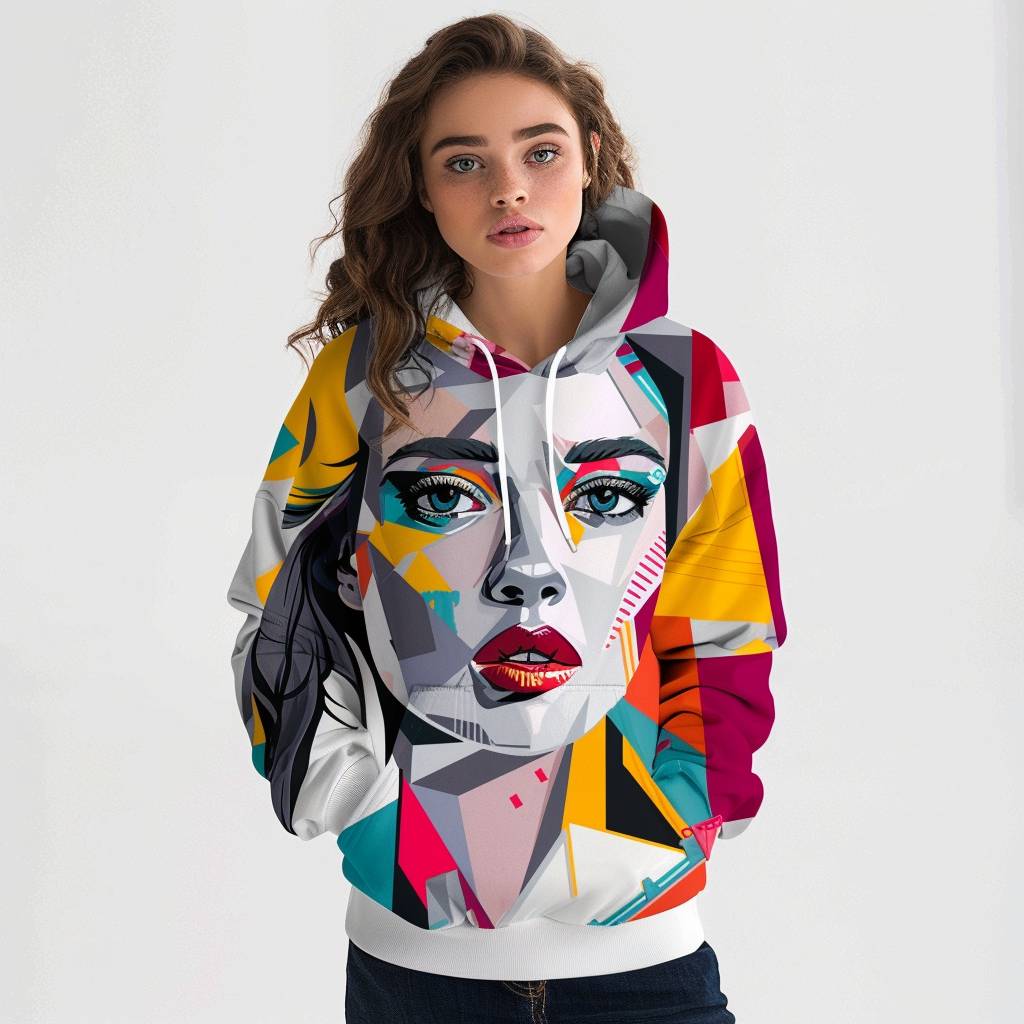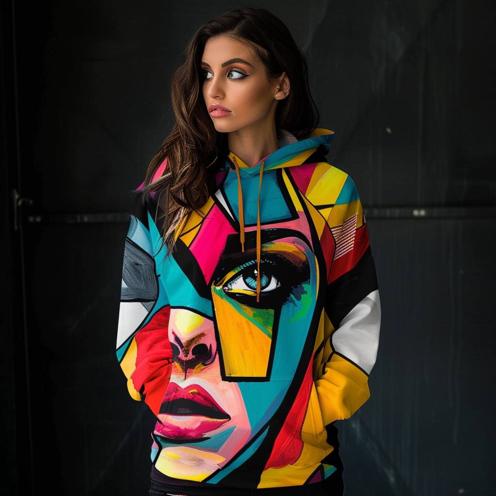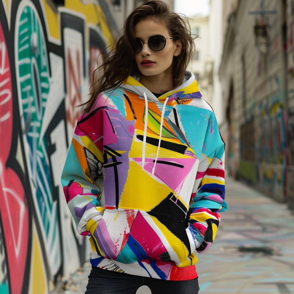 A young and stunning woman wearing a vibrant, abstract expressionist pop art hoodie, featuring bold colors and geometric shapes inspired by the pop art movement.