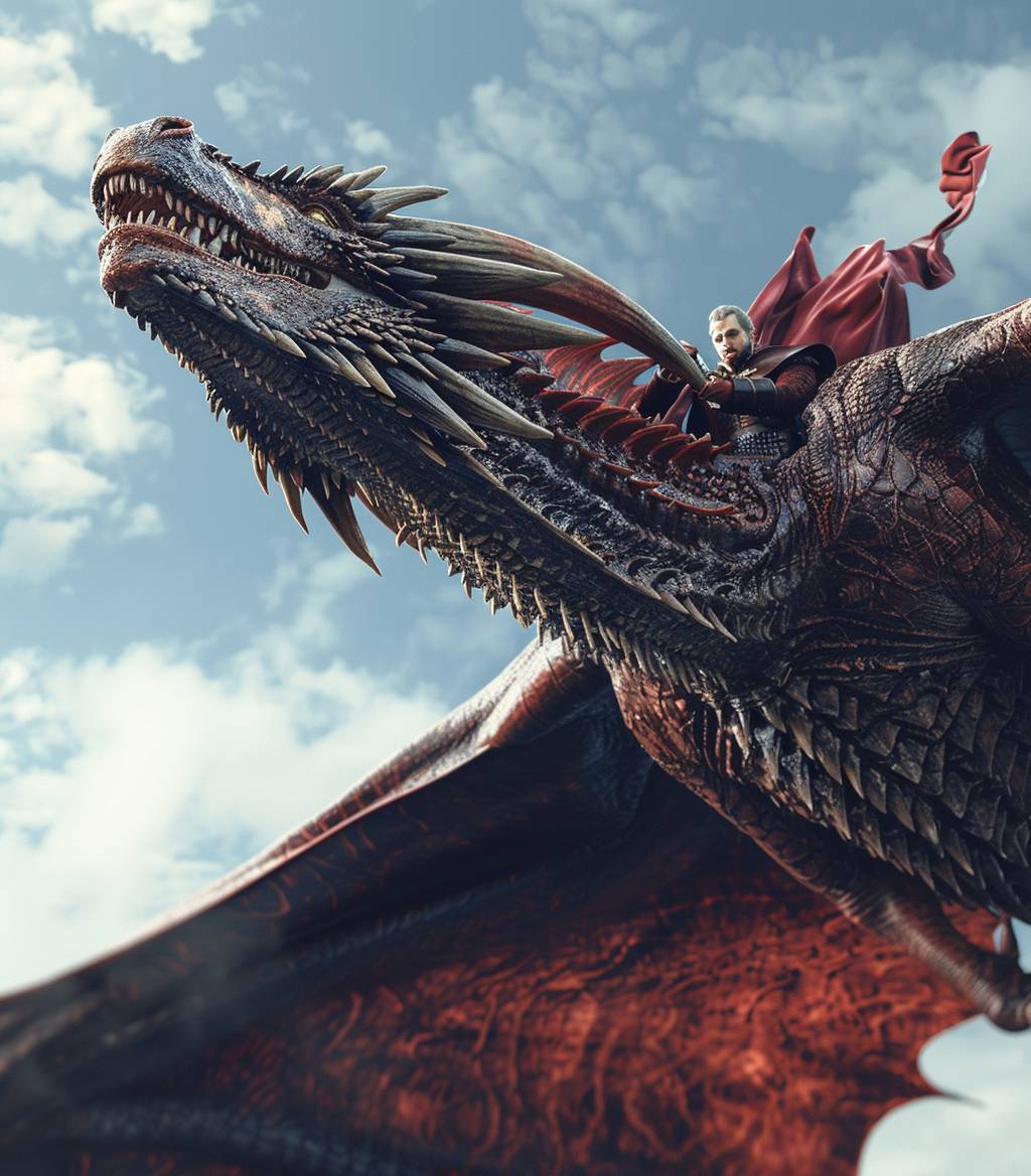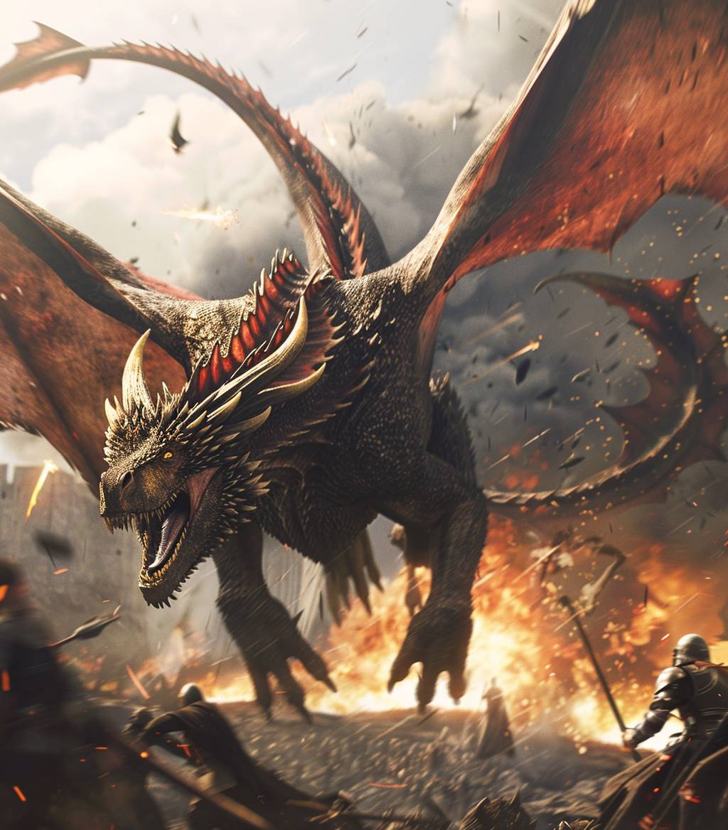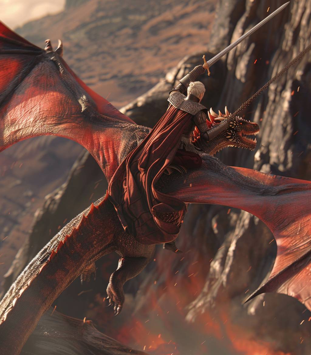 House of the Dragon Scene featuring a Targaryen prince, engaged in a dragon-riding battle, set in the skies above King's Landing, capturing the essence of power, betrayal, and the struggle for the Iron Throne, style focusing on epic landscapes, intricate costumes, and intense drama, game of thrones style, film render --ar 7:8 --v 6.0