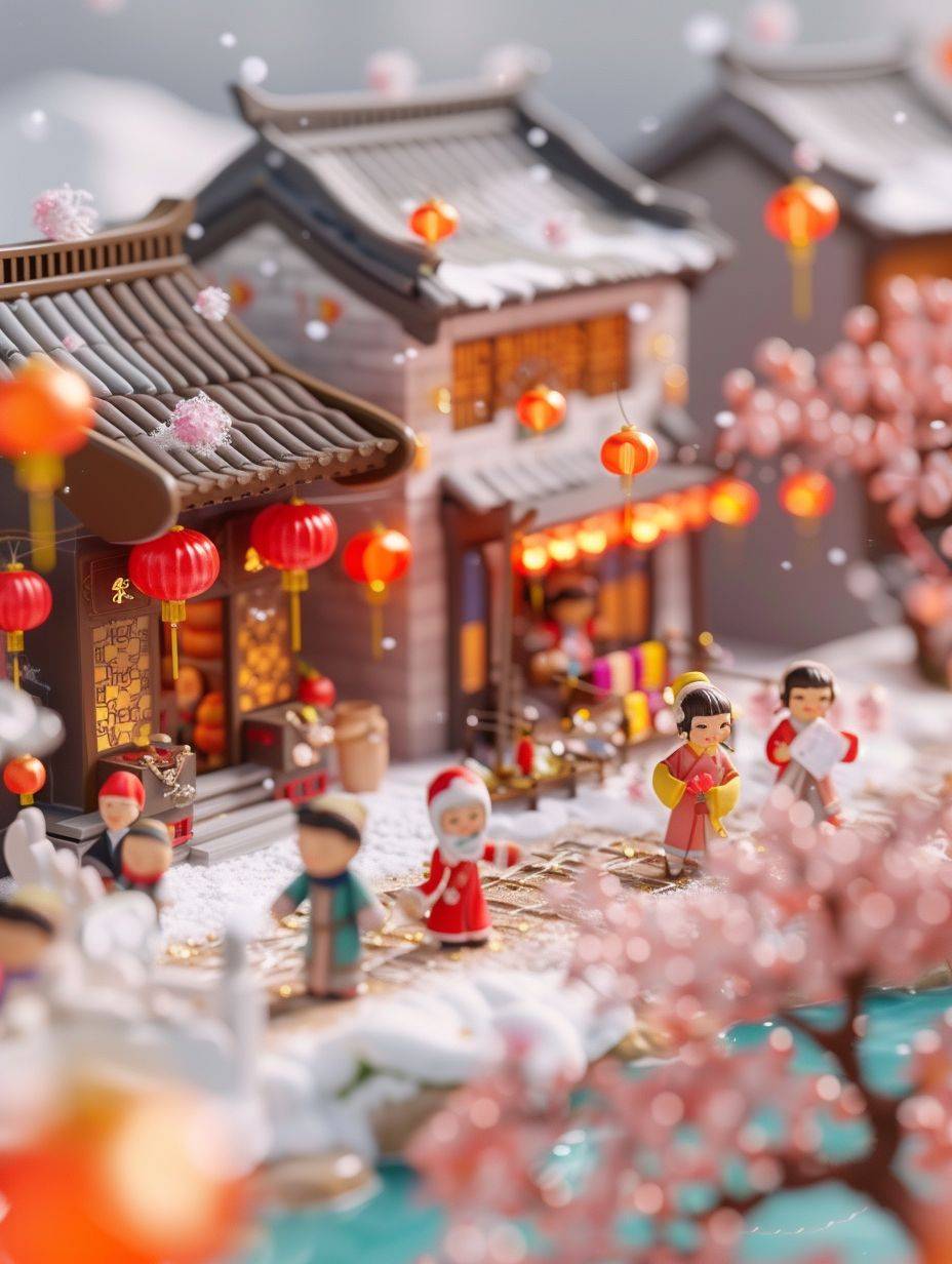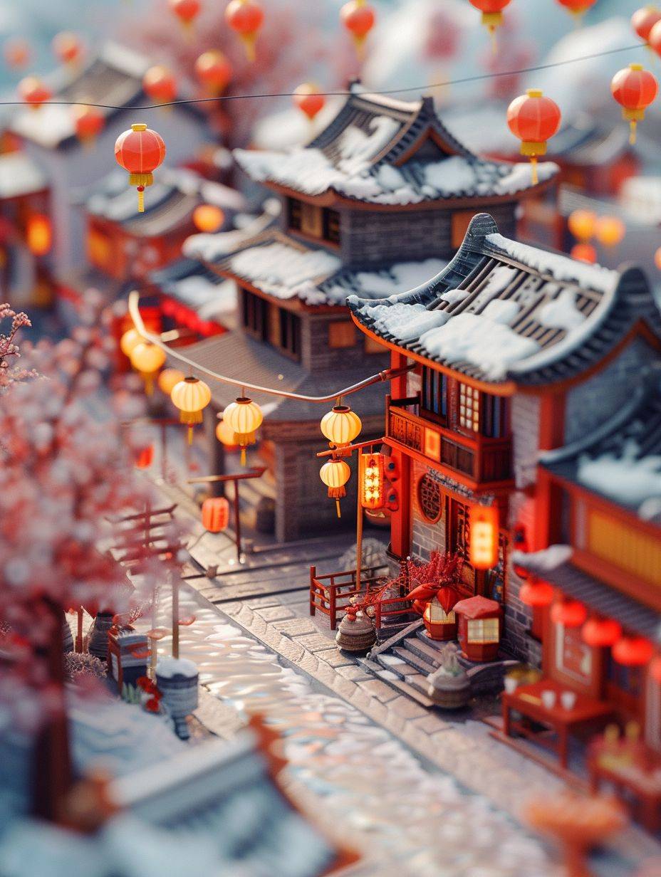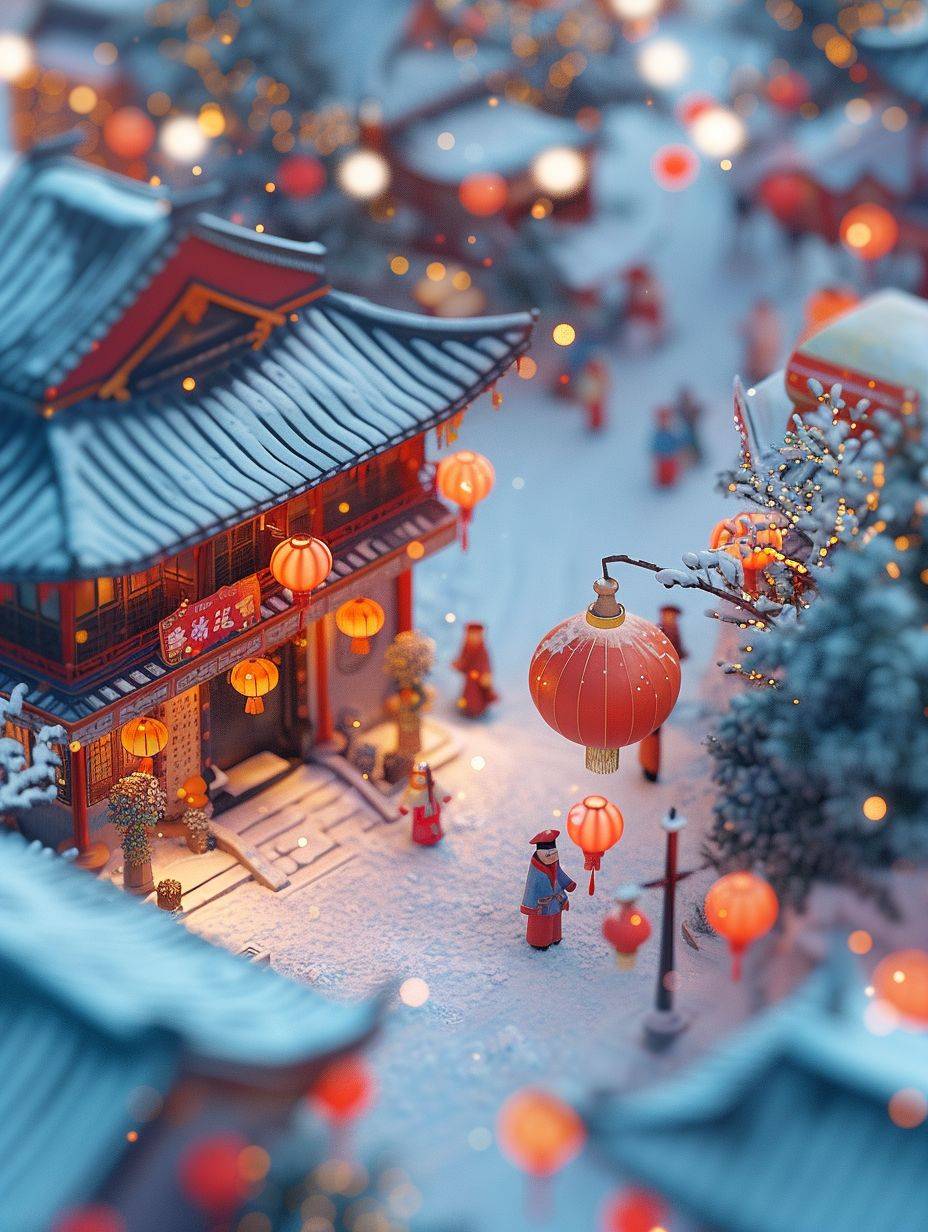 Miniaturized, Spring Festival Town isometric view, super cute clay world, cute clay stop-motion animation, Chinese New Year lanterns, Spring couplets, gather outside, lively atmosphere, Palace, tilt movement, excellent lighting, snow, volume landscape, brush rendering, tilt movement, 3D, super detail, 32k --ar 3:4 --v 6