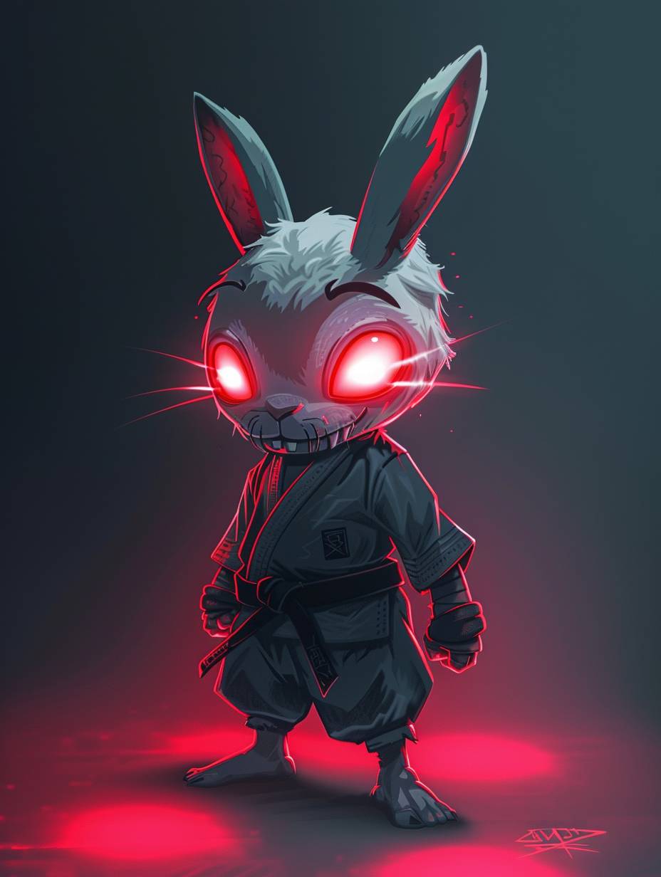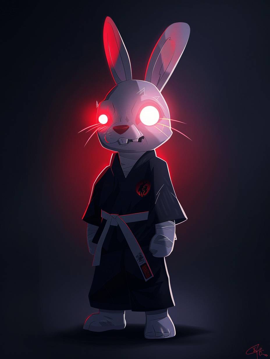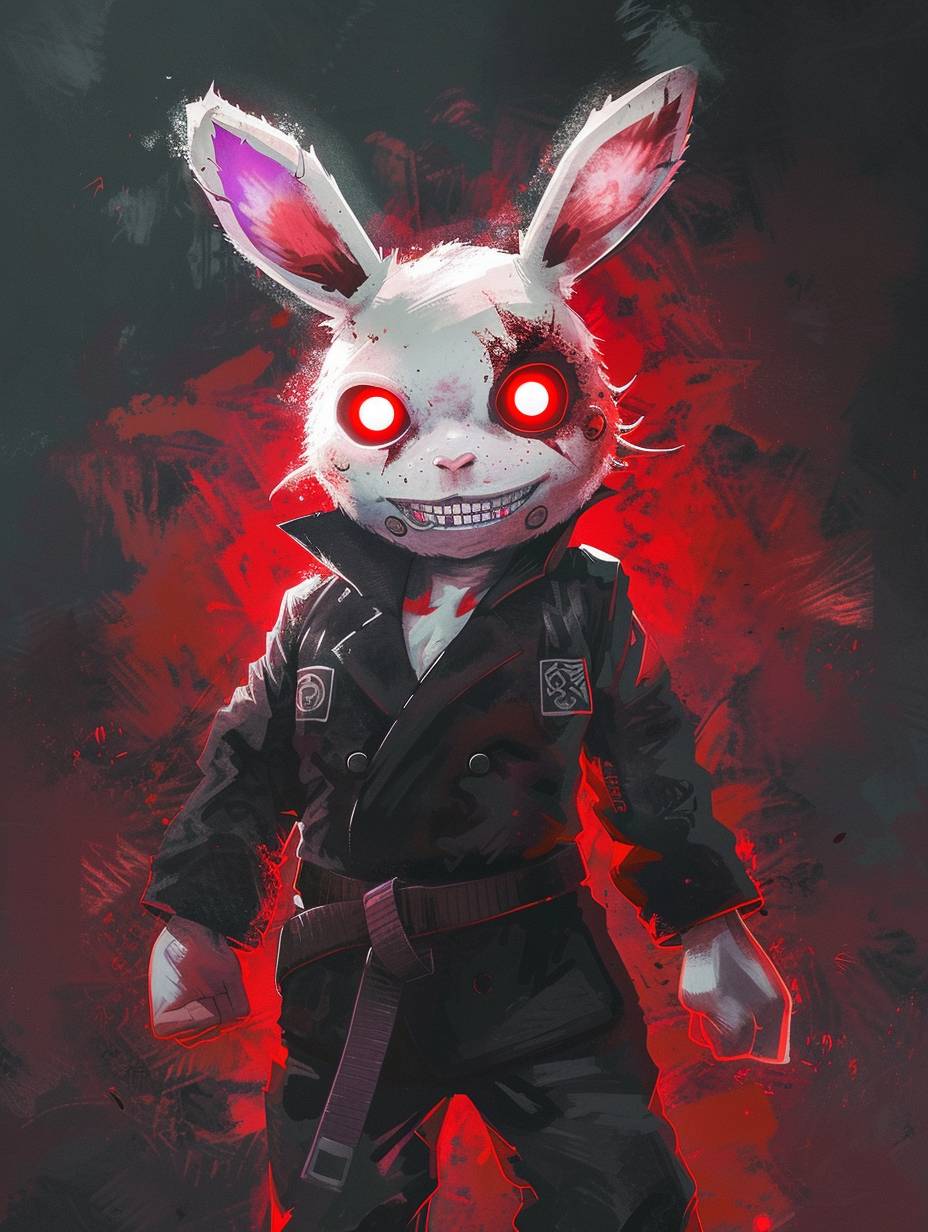 Full body white rabbit in judo uniform with glowing red eyes and a psychotic smile.