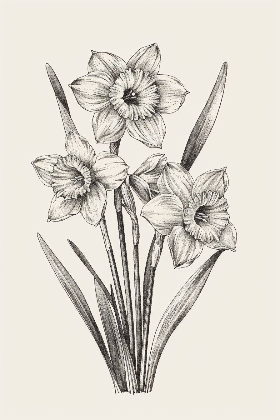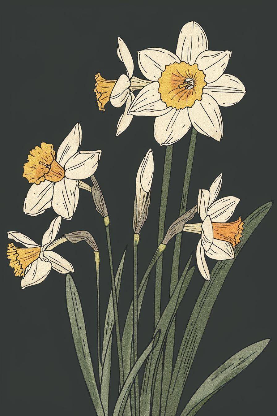 illustrations of narcissus flower, in the style of victorian-inspired illustrations, vintage, the bechers' typologies, nineteenth century french realism, outline, 500–1000 ce, rustic charm --style raw --ar 2:3 --v 6