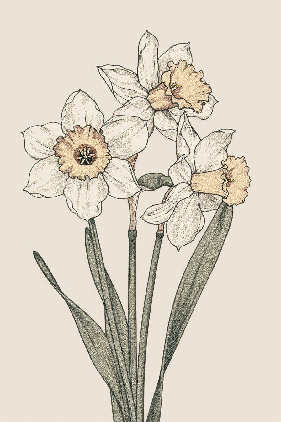 Illustrations of the narcissus flower in Victorian style, featuring rustic charm and elements of 19th century French realism and Becher's typologies.