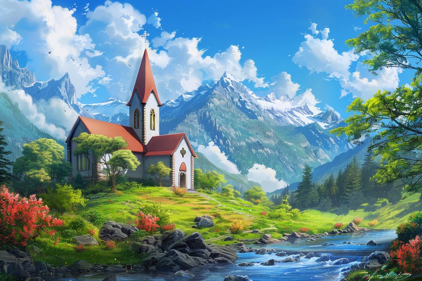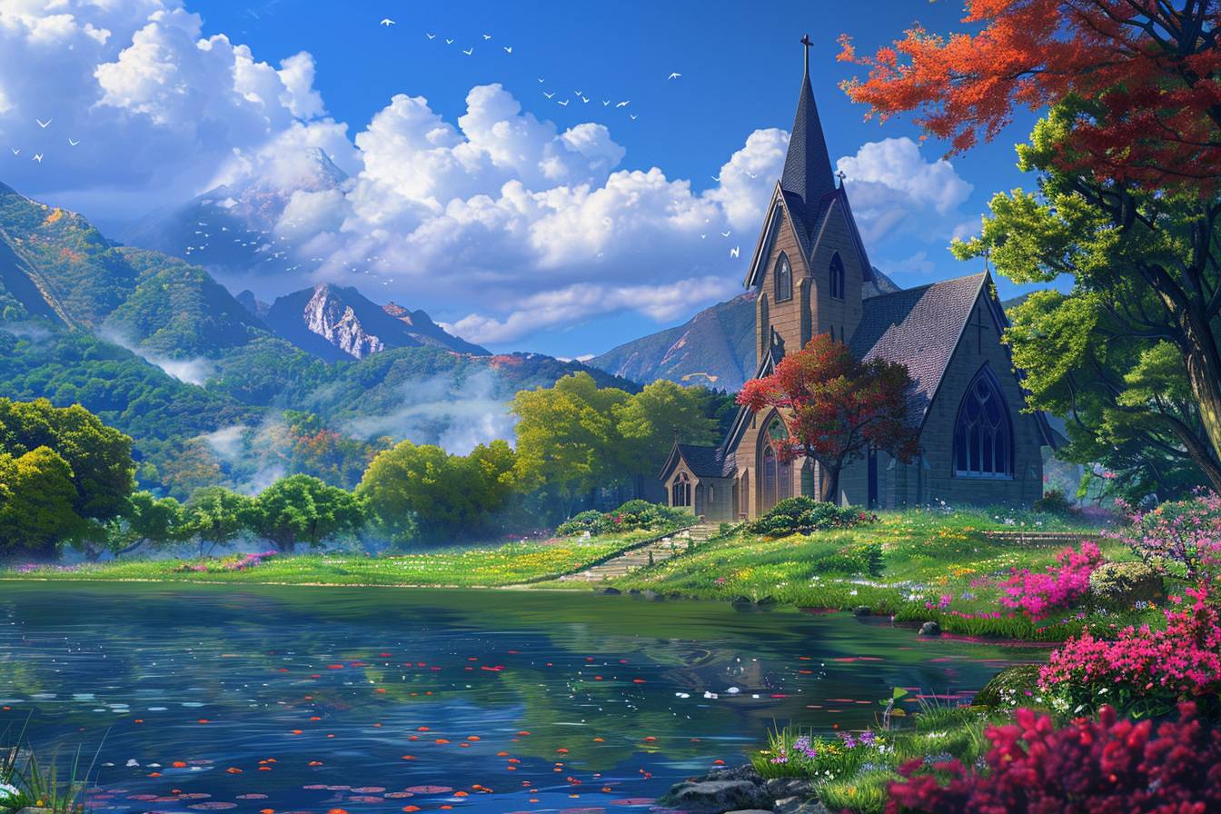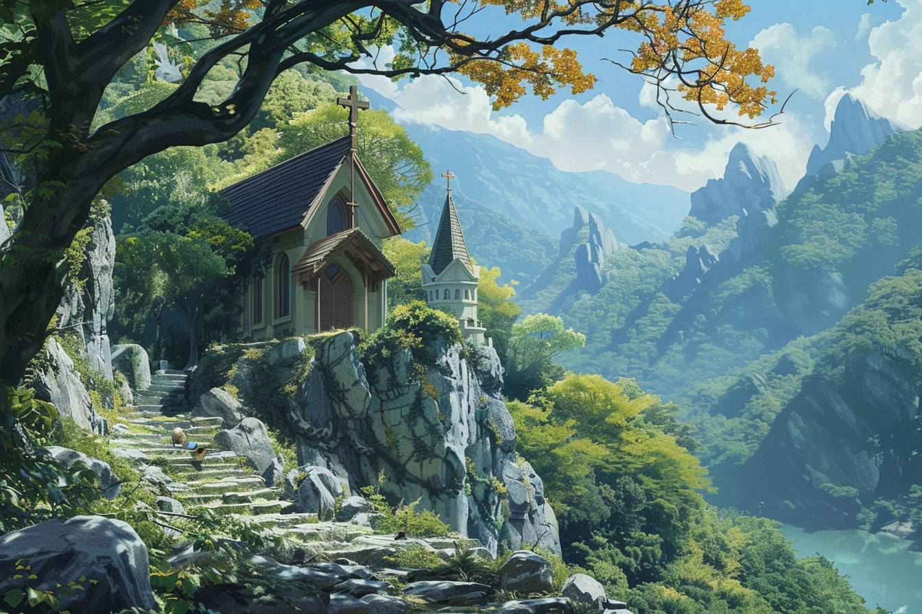 Natural landscape and church in the style of Akira Toriyama