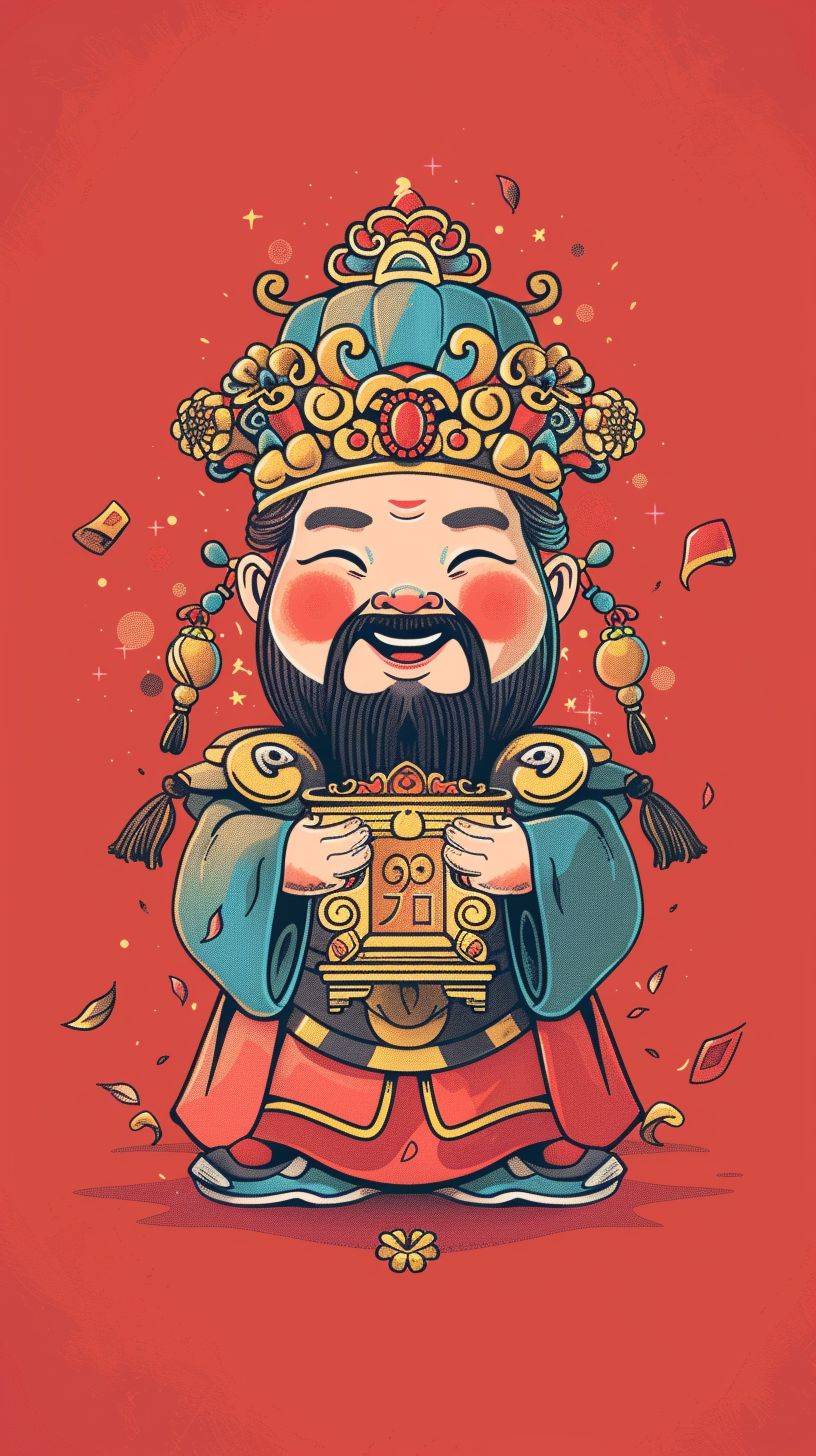 Cute Chinese God of Wealth holding a large ingot, smiling, set against a minimalist light red background.